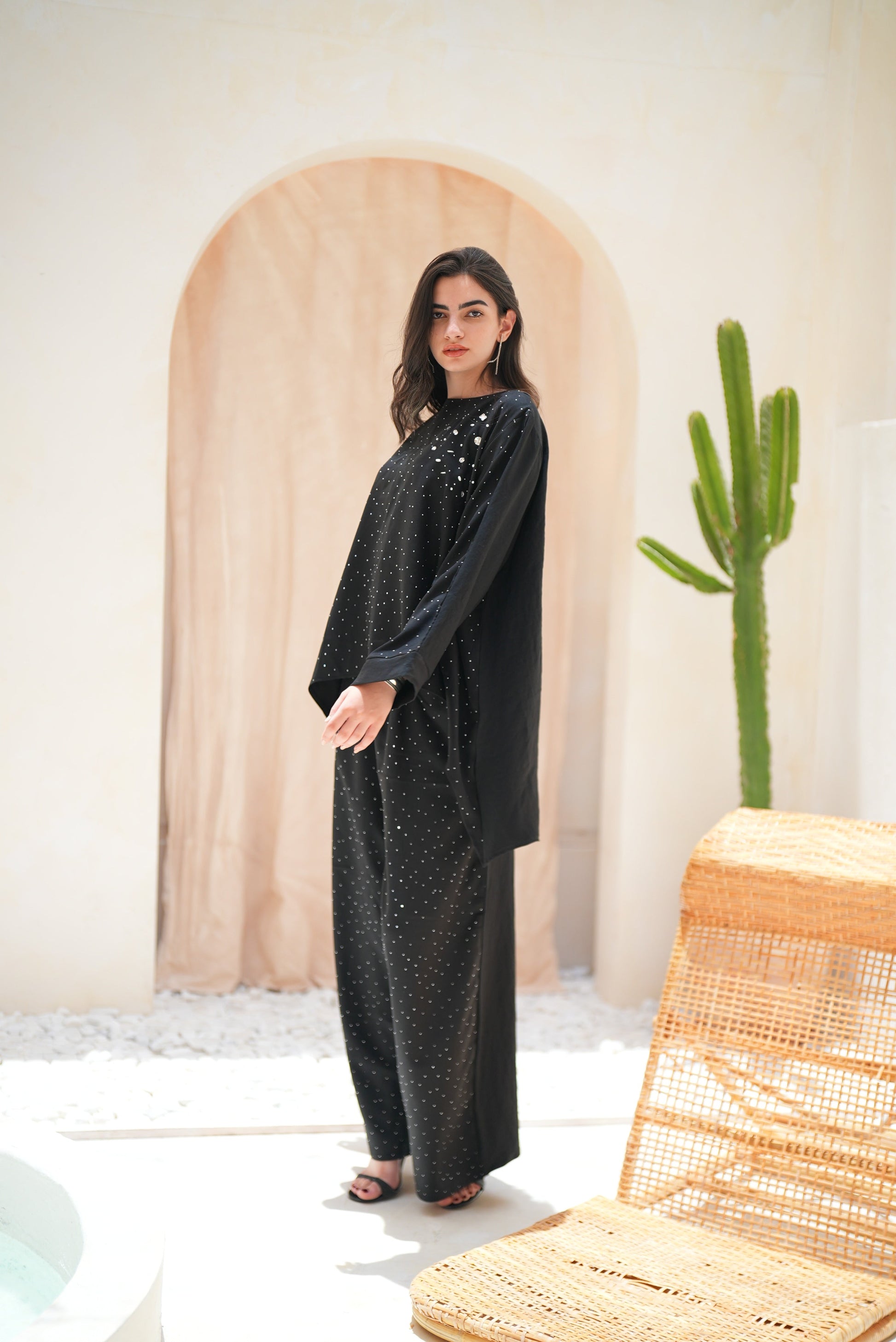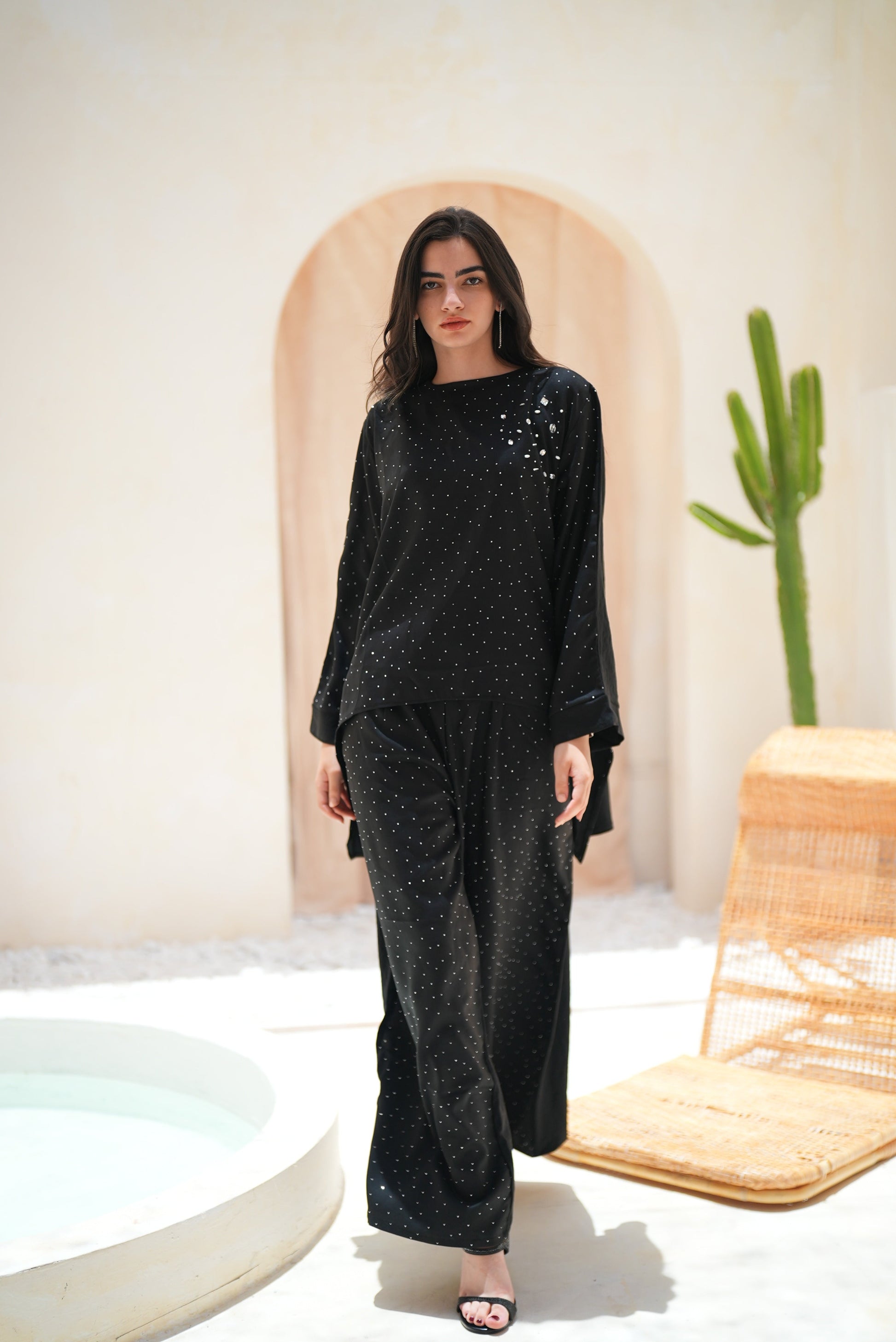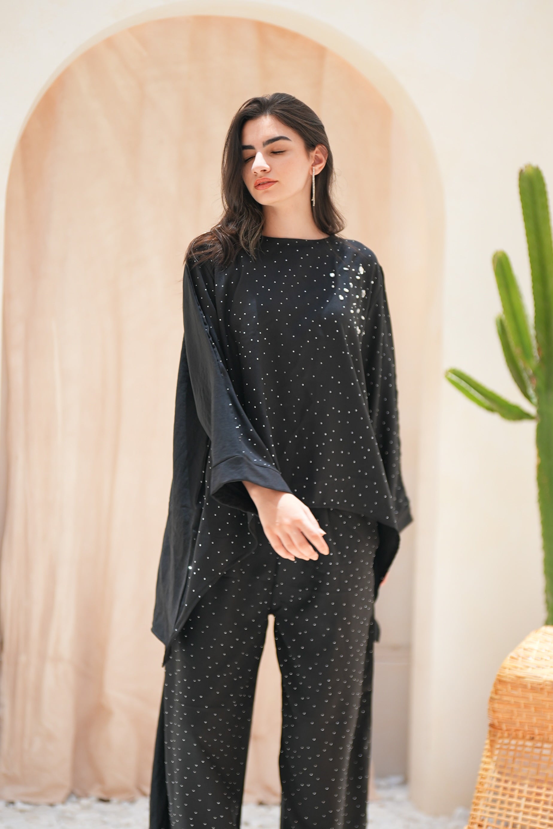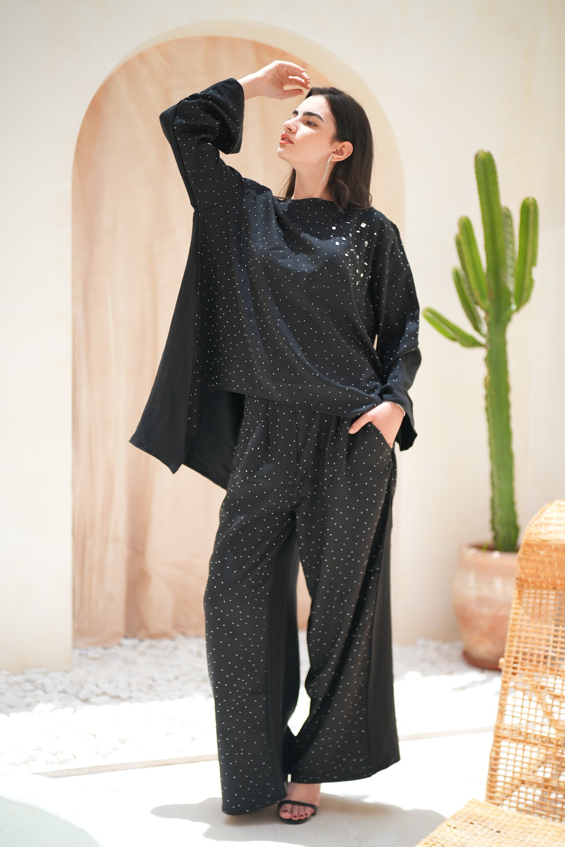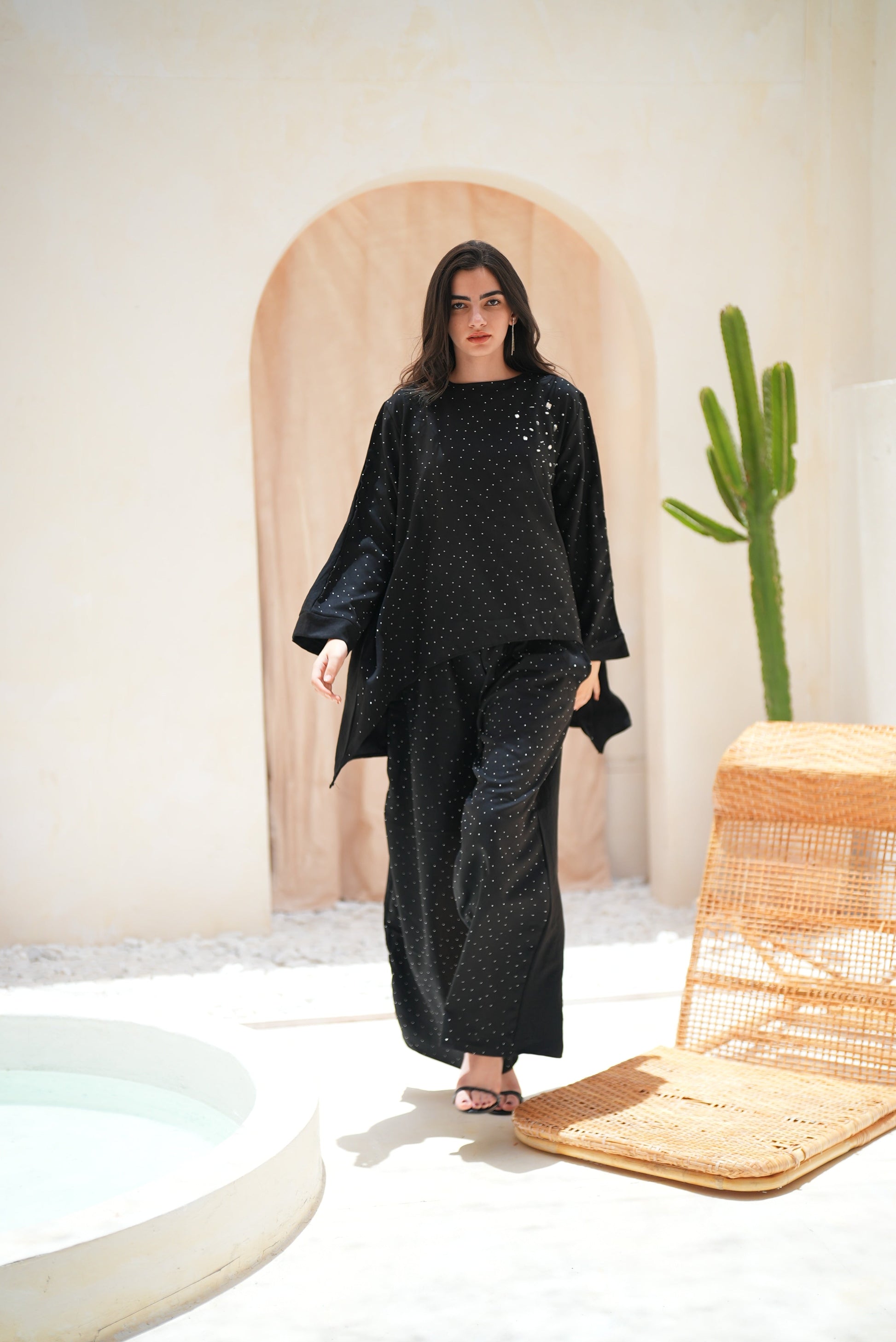 Clean lines meet refined details in this black set, pants have 2 side pockets