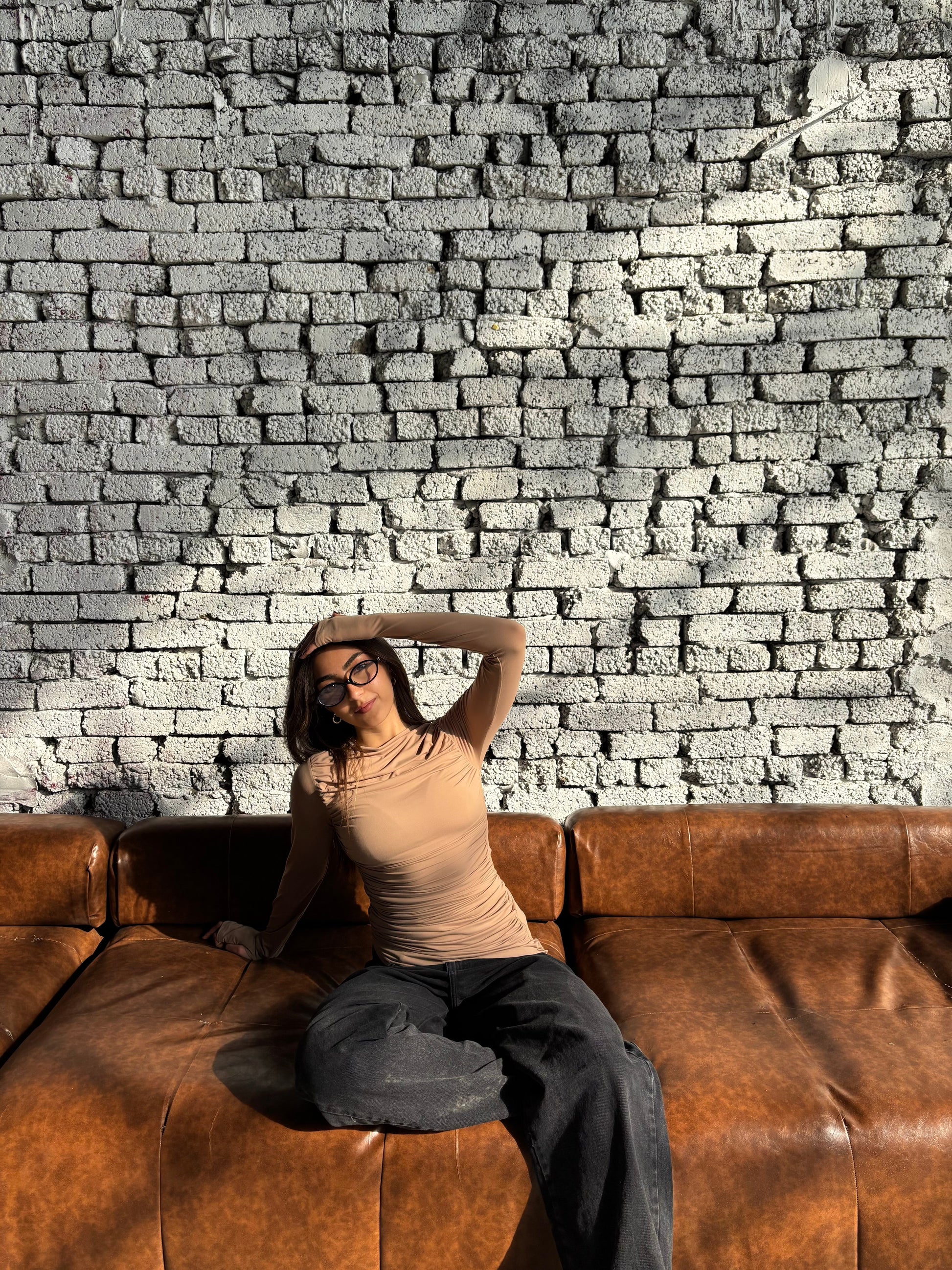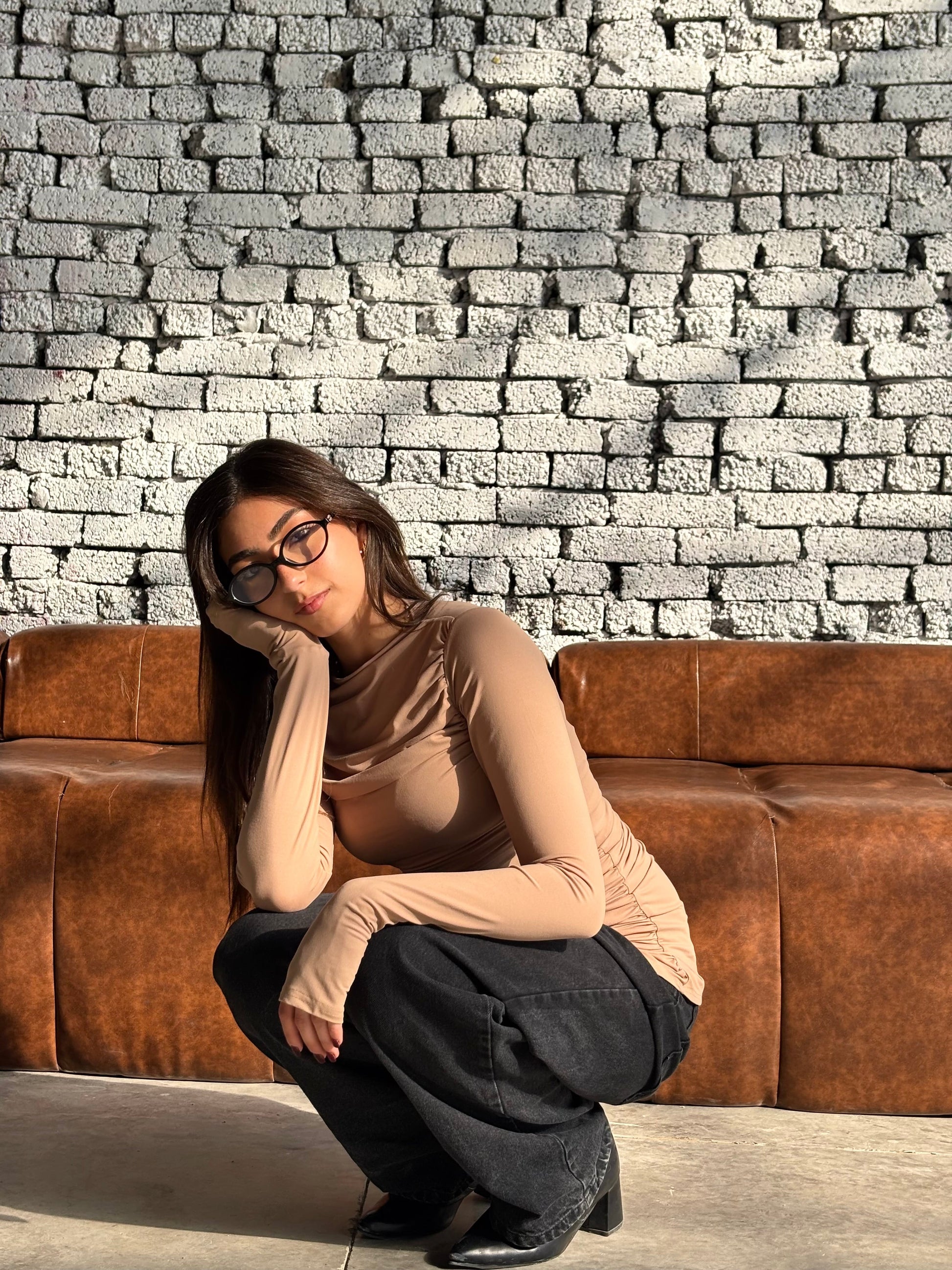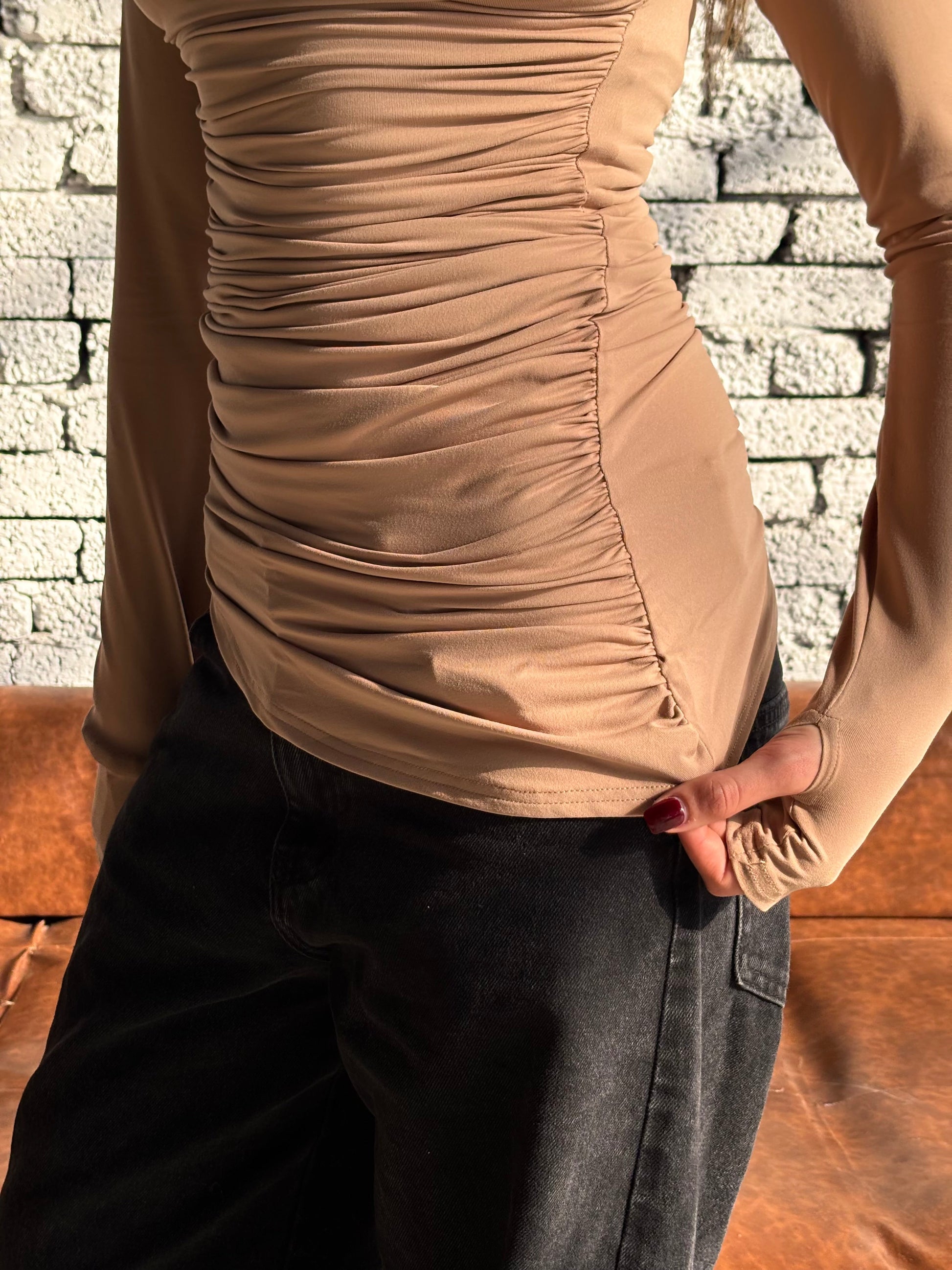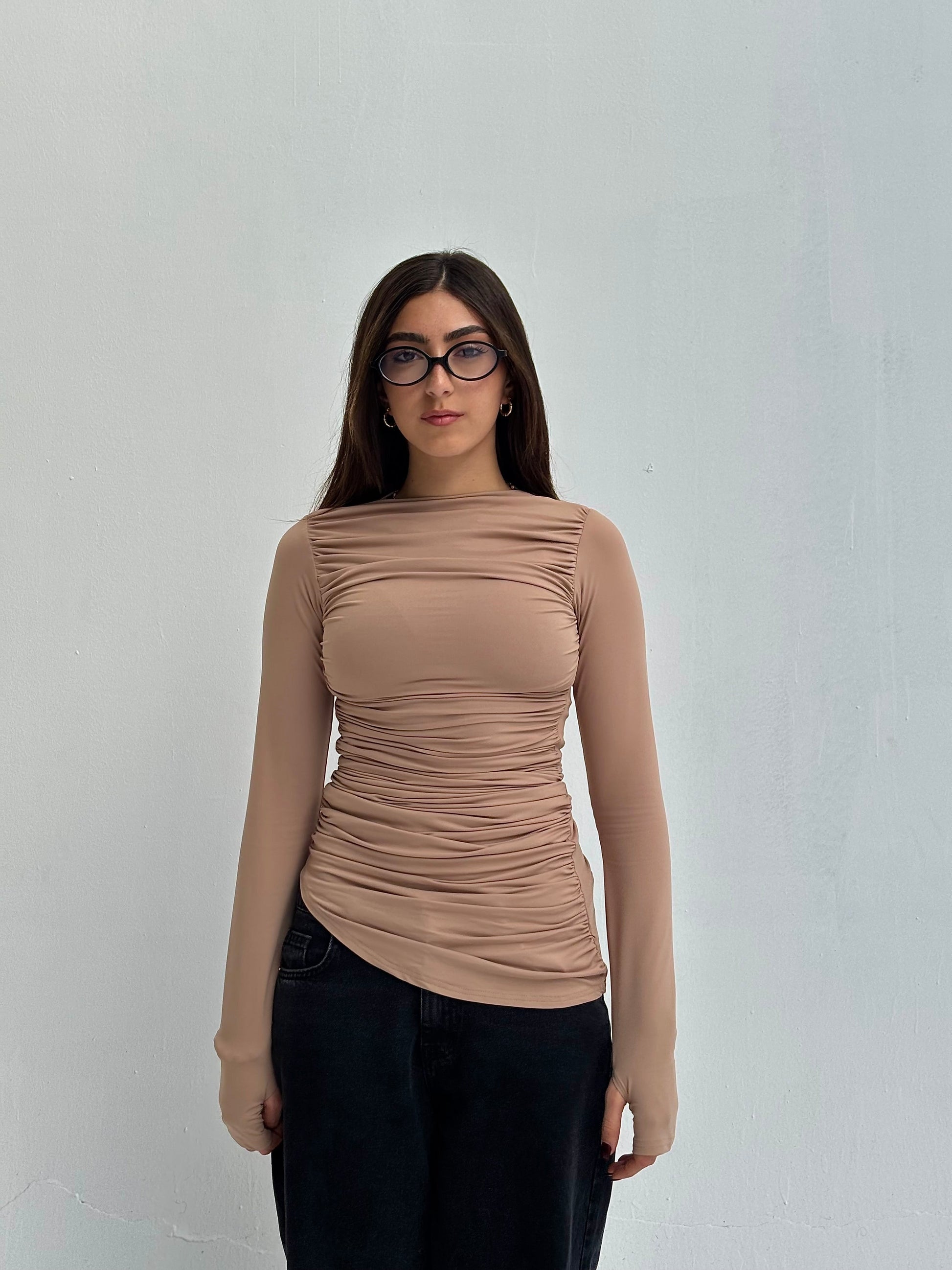 Body contouring top made of Jersey Fabric, draped cut, asymmetrical hemline, double layered with thumb hole to give you more comfort and effortless stylish look.