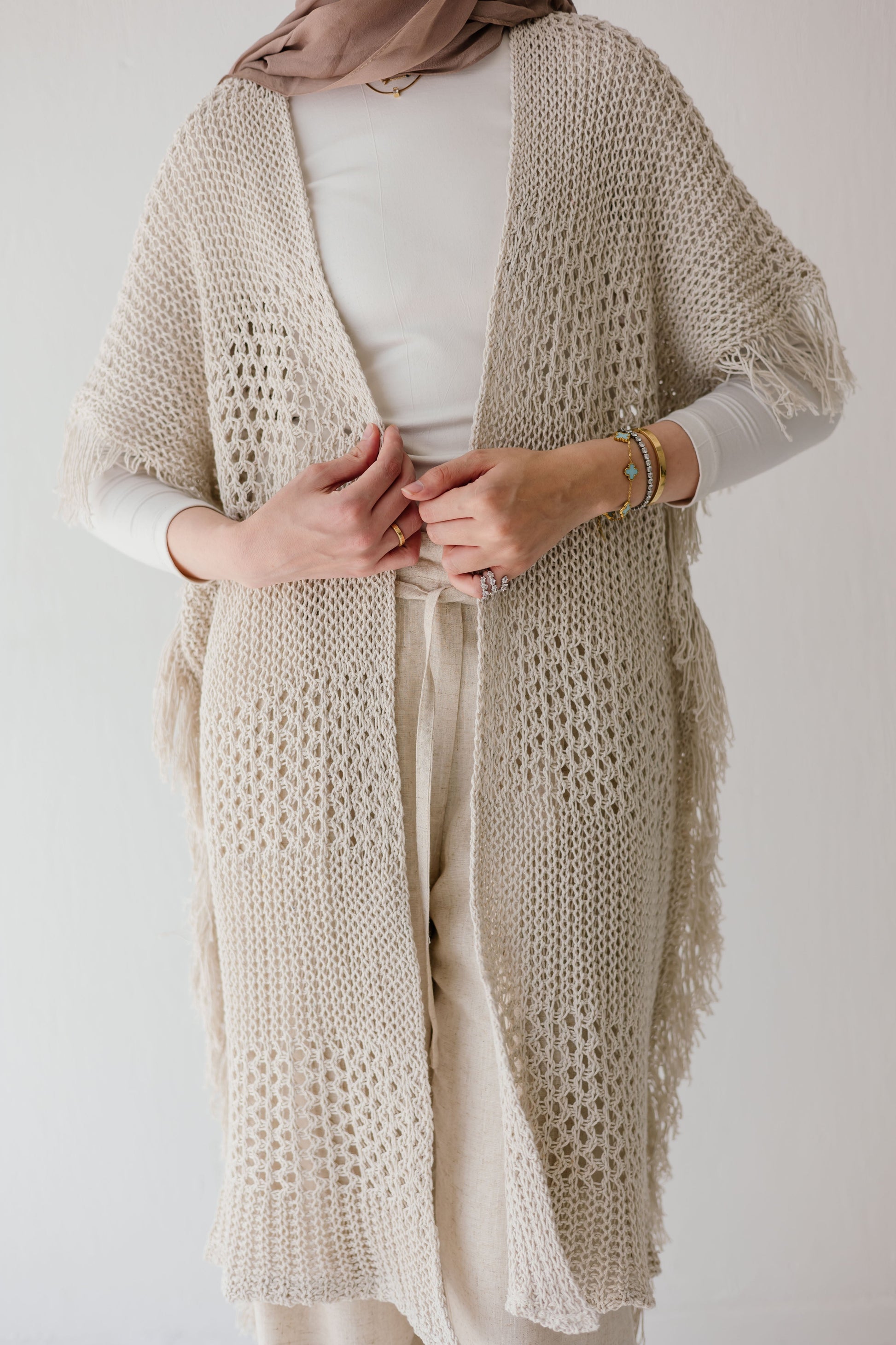 Layer up with the Crochet Fringed Cardigan in Oat — a breezy knit with soft tassel details, perfect for adding texture to your summer look.