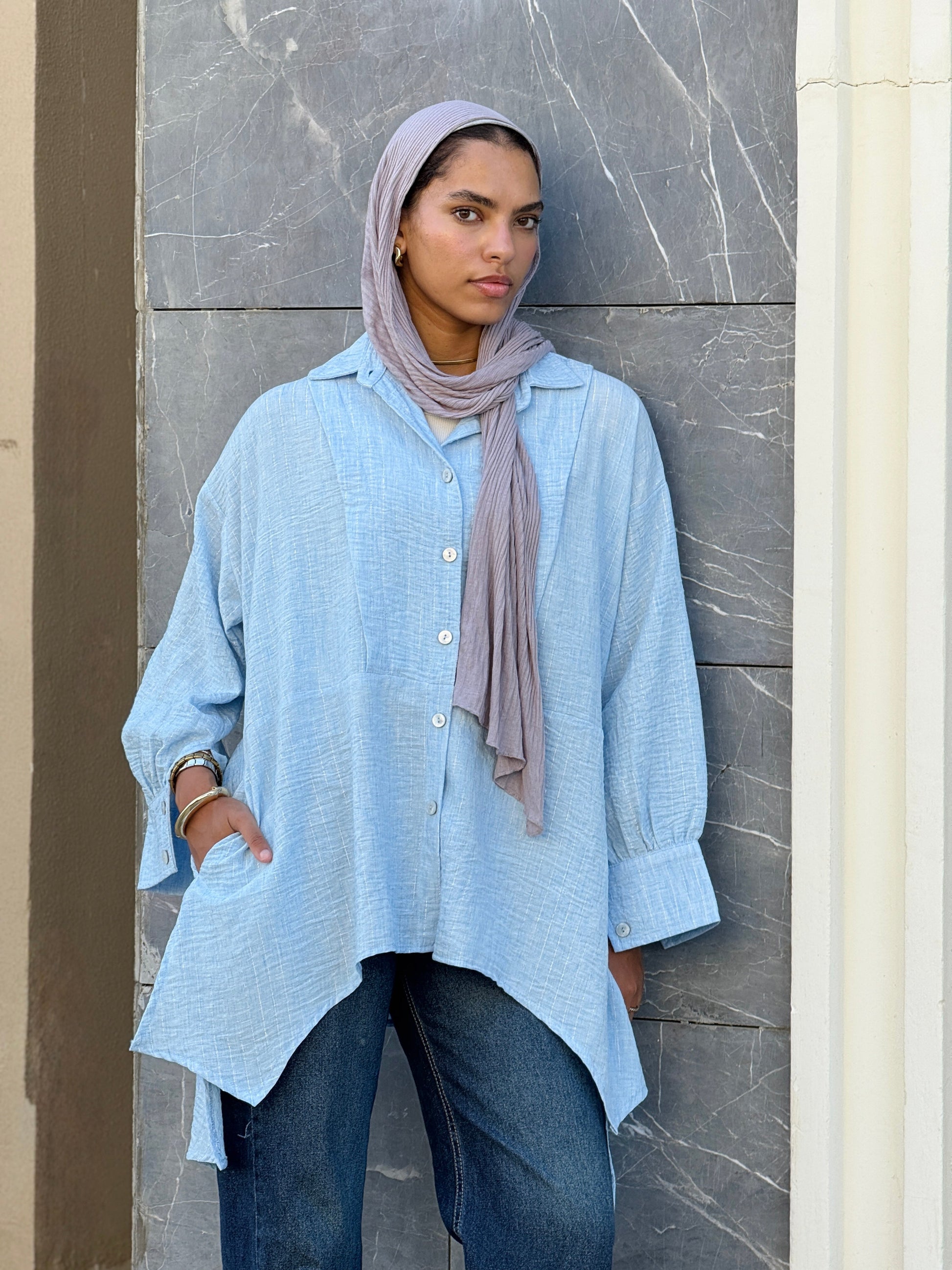 - Slightly oversized style that makes it versatile for layering.