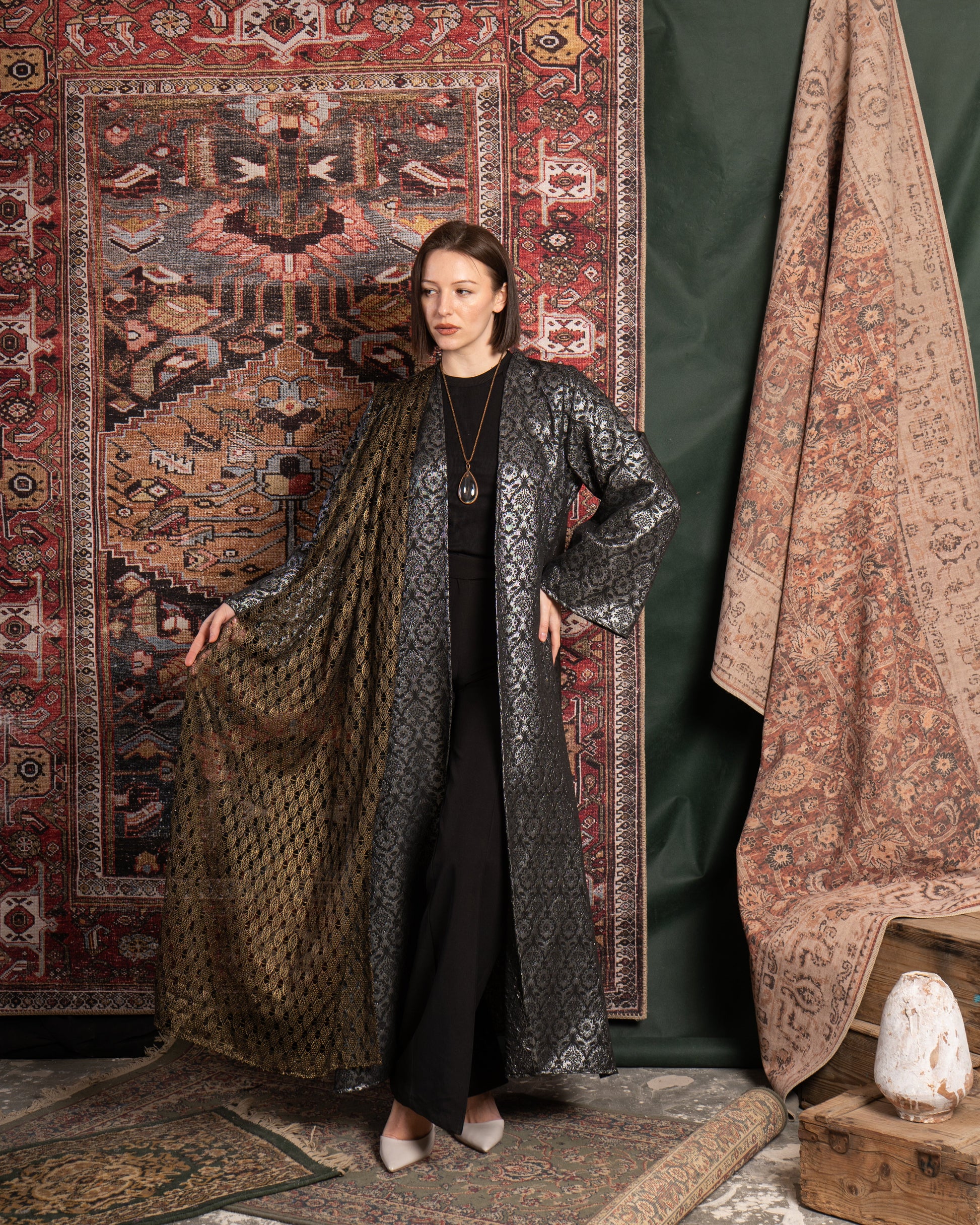 Our rich brocade fabric in silver and black is paired with a metallic copper shawl on one side. It comes with a belt, allowing you to wear it in multiple ways