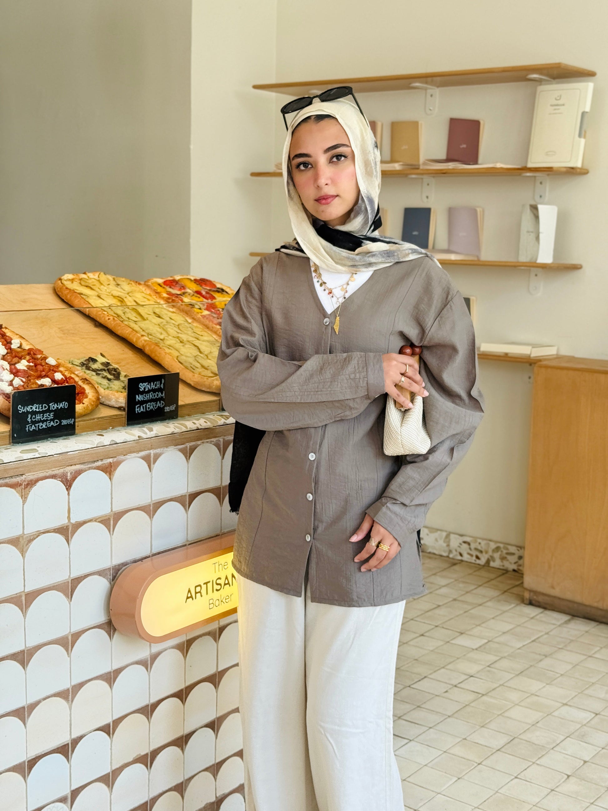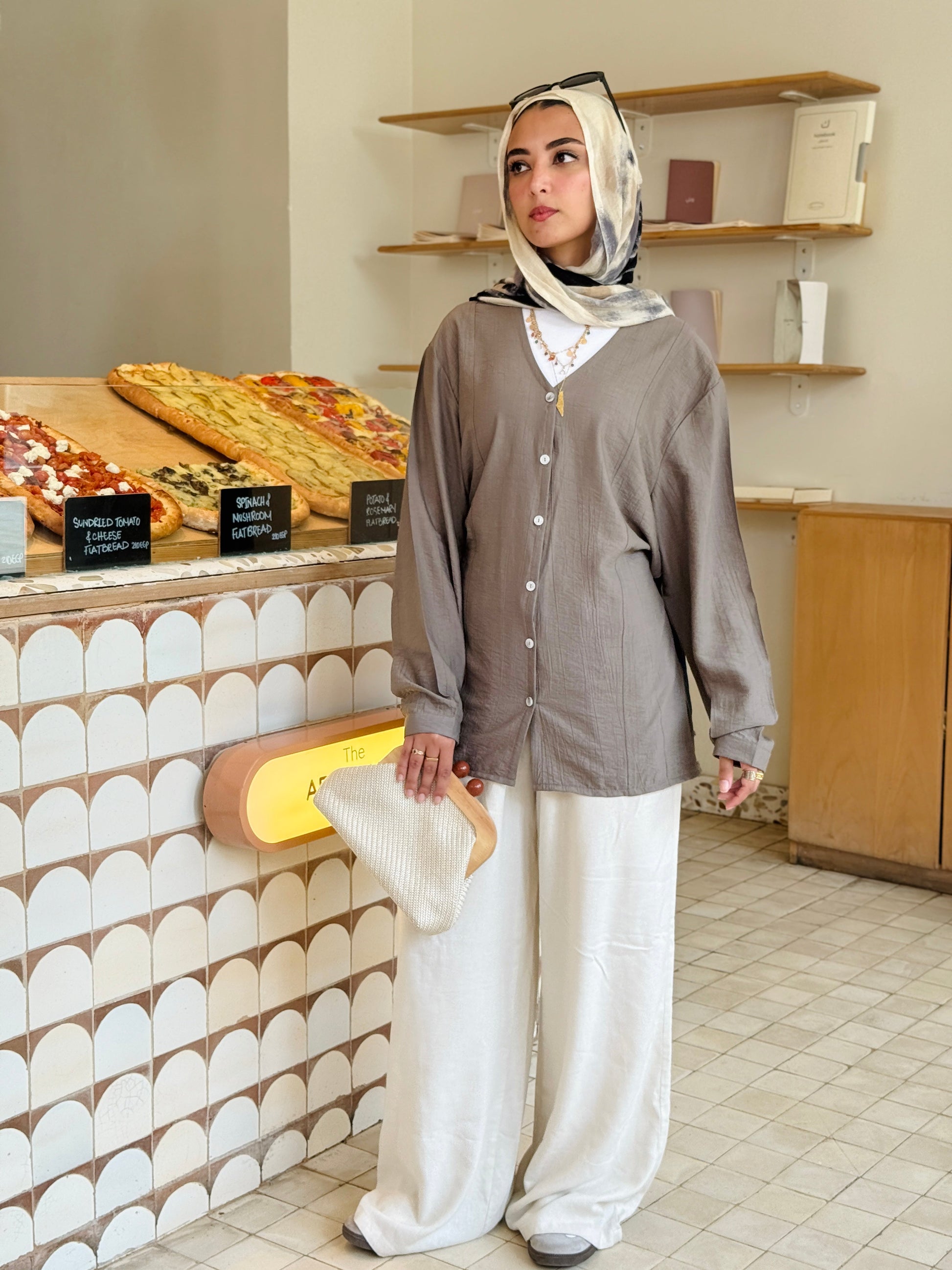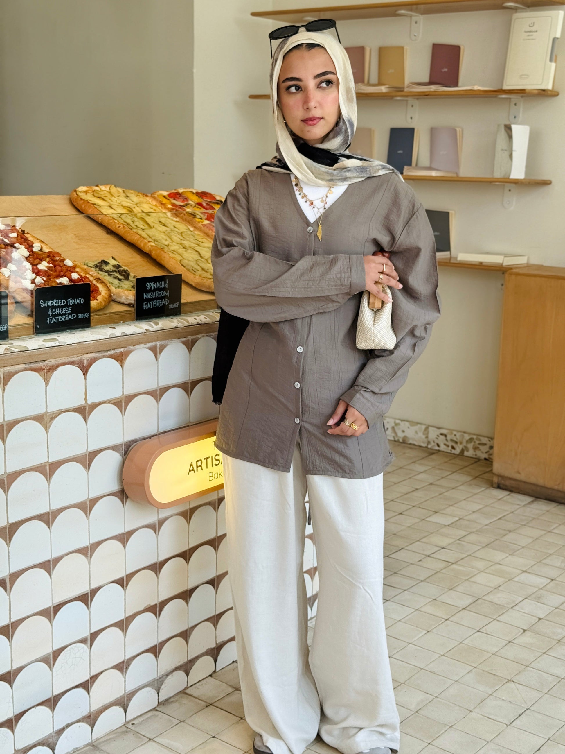 a taupe gray color — a muted shade that blends soft brown and gray tones, giving it an earthy and neutral look.