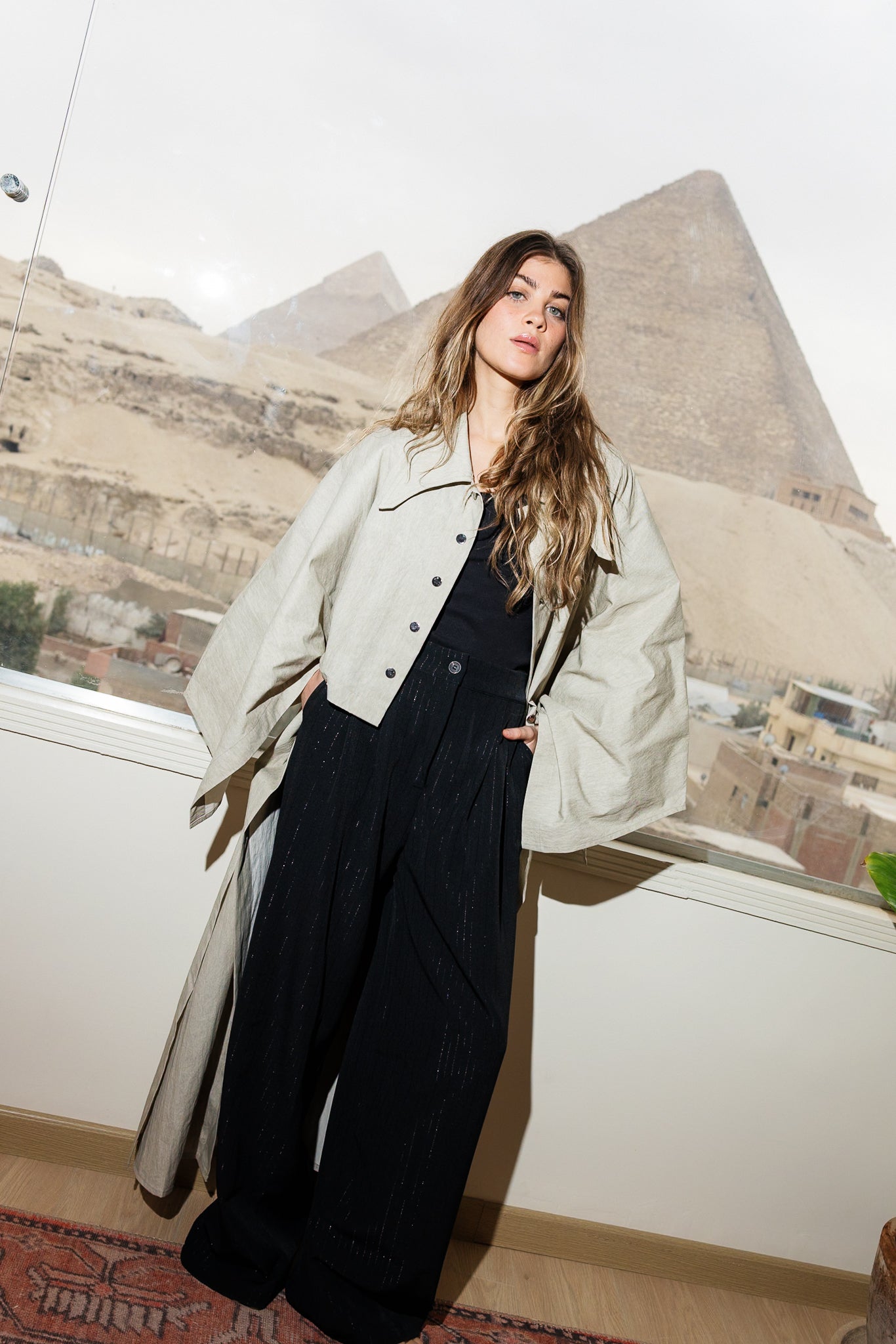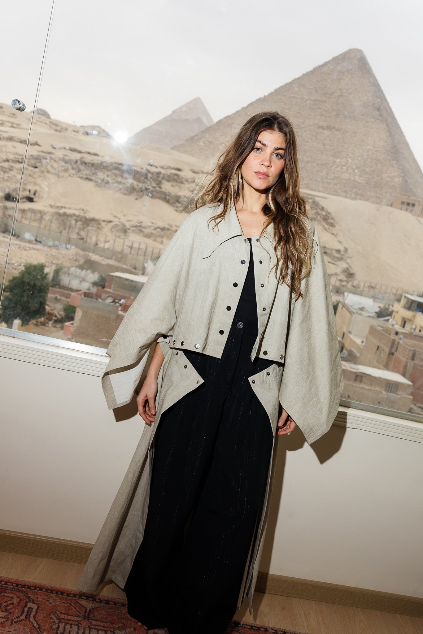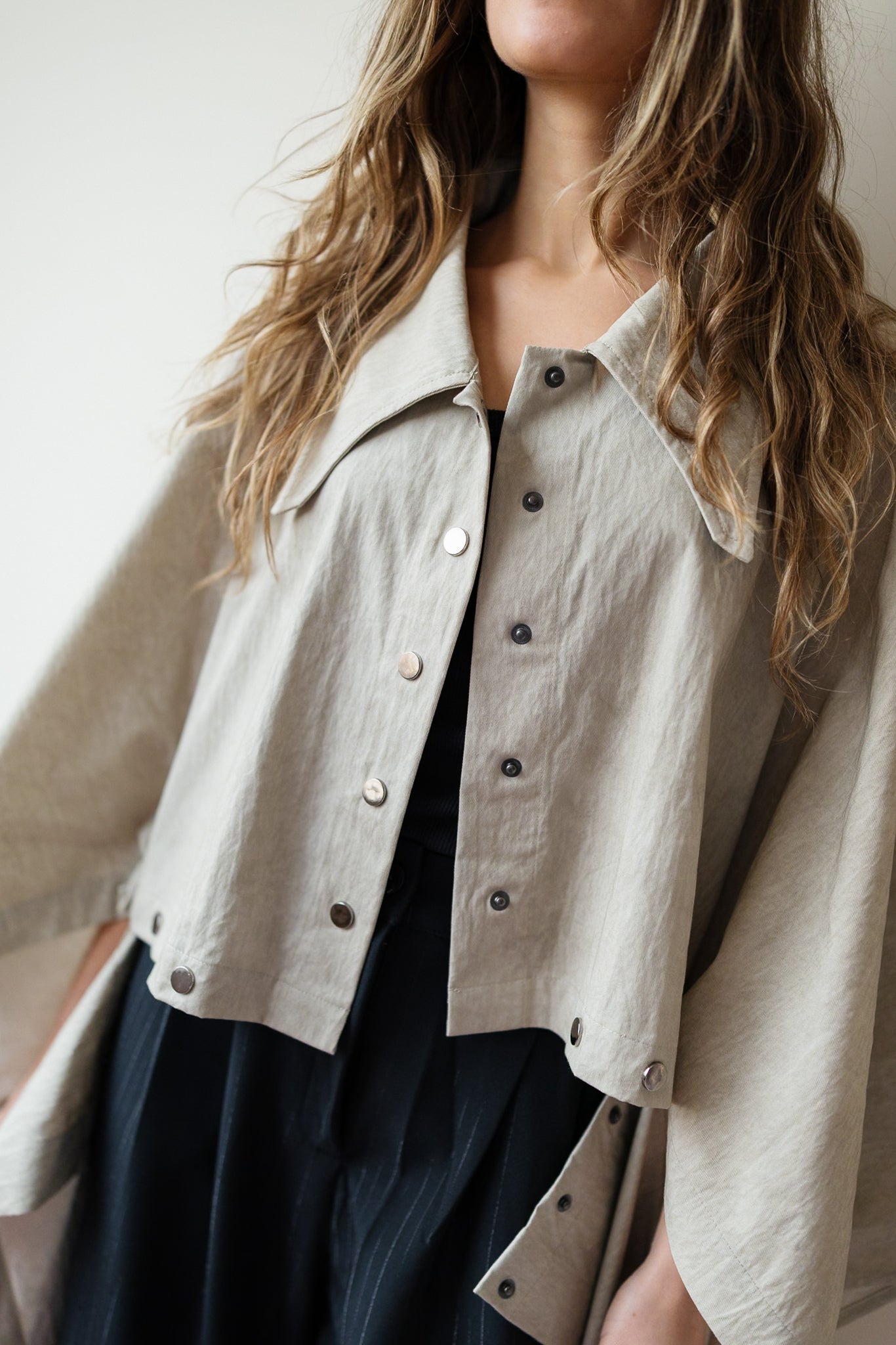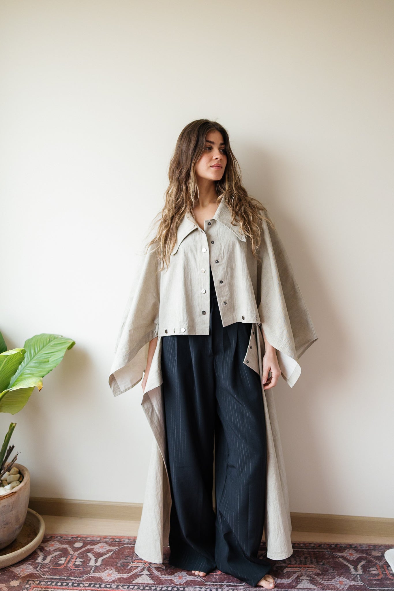 Relaxed outerwear Kaftan with a cropped front and full-length back. Wide sleeves and pointed collars.