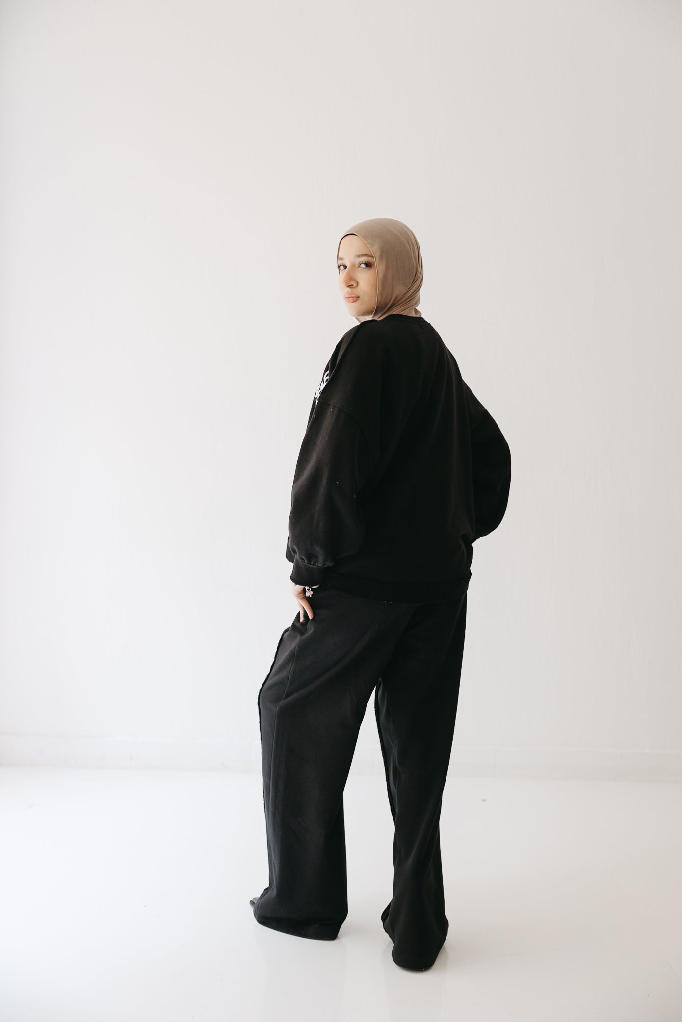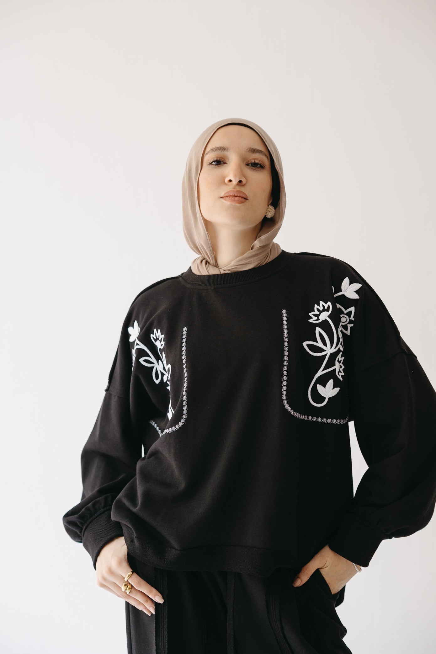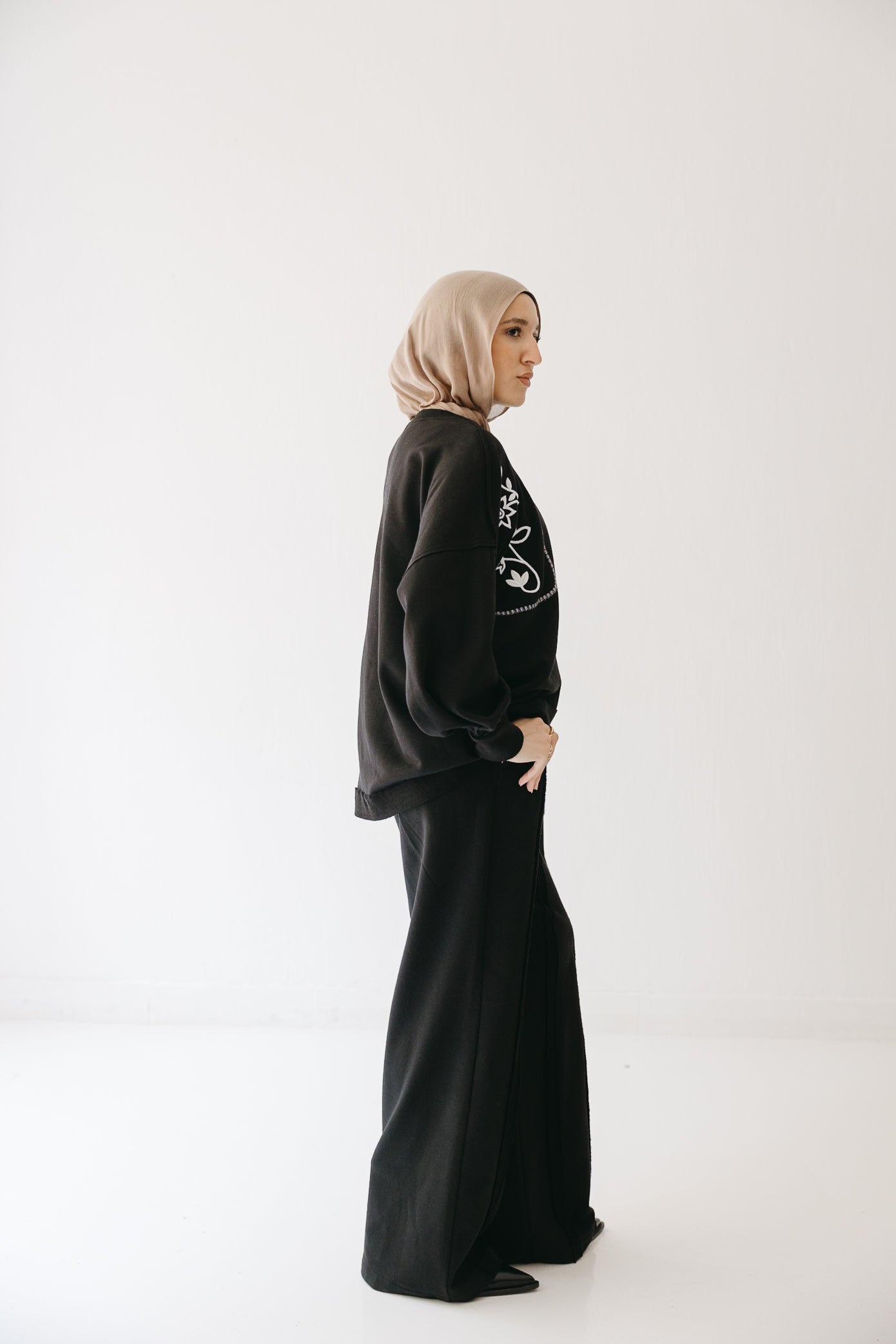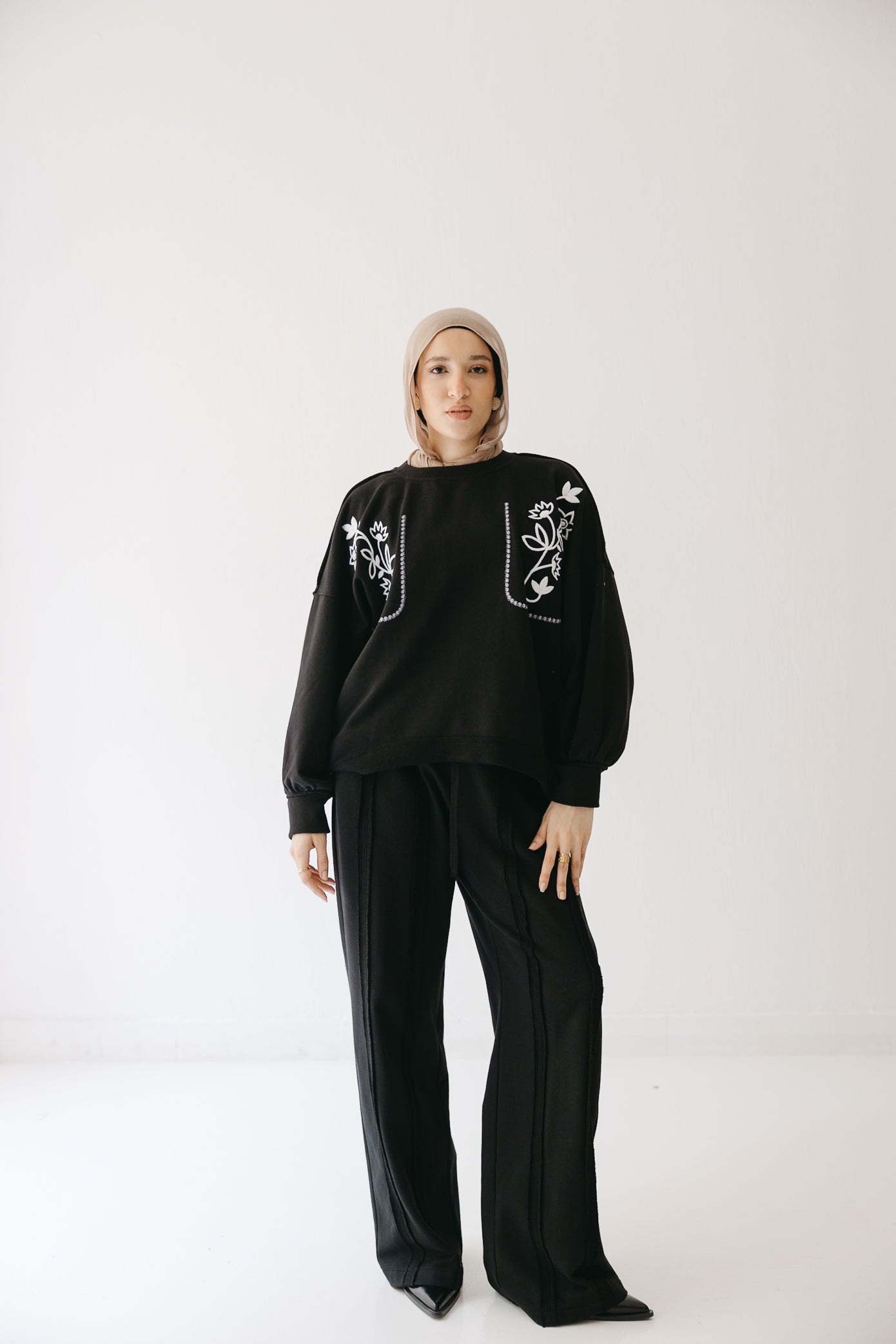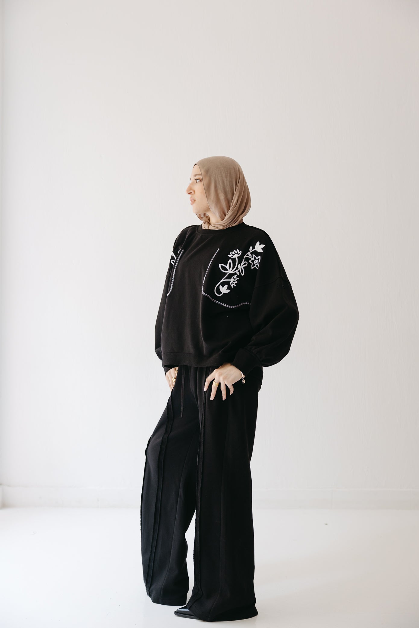 An elevated take on everyday comfort — crafted from soft black Milton fabric and adorned with delicate white floral embroidery. The oversized top paired with wide-leg pants creates a relaxed yet refined silhouette, making it the perfect blend of effortless style and timeless elegance.