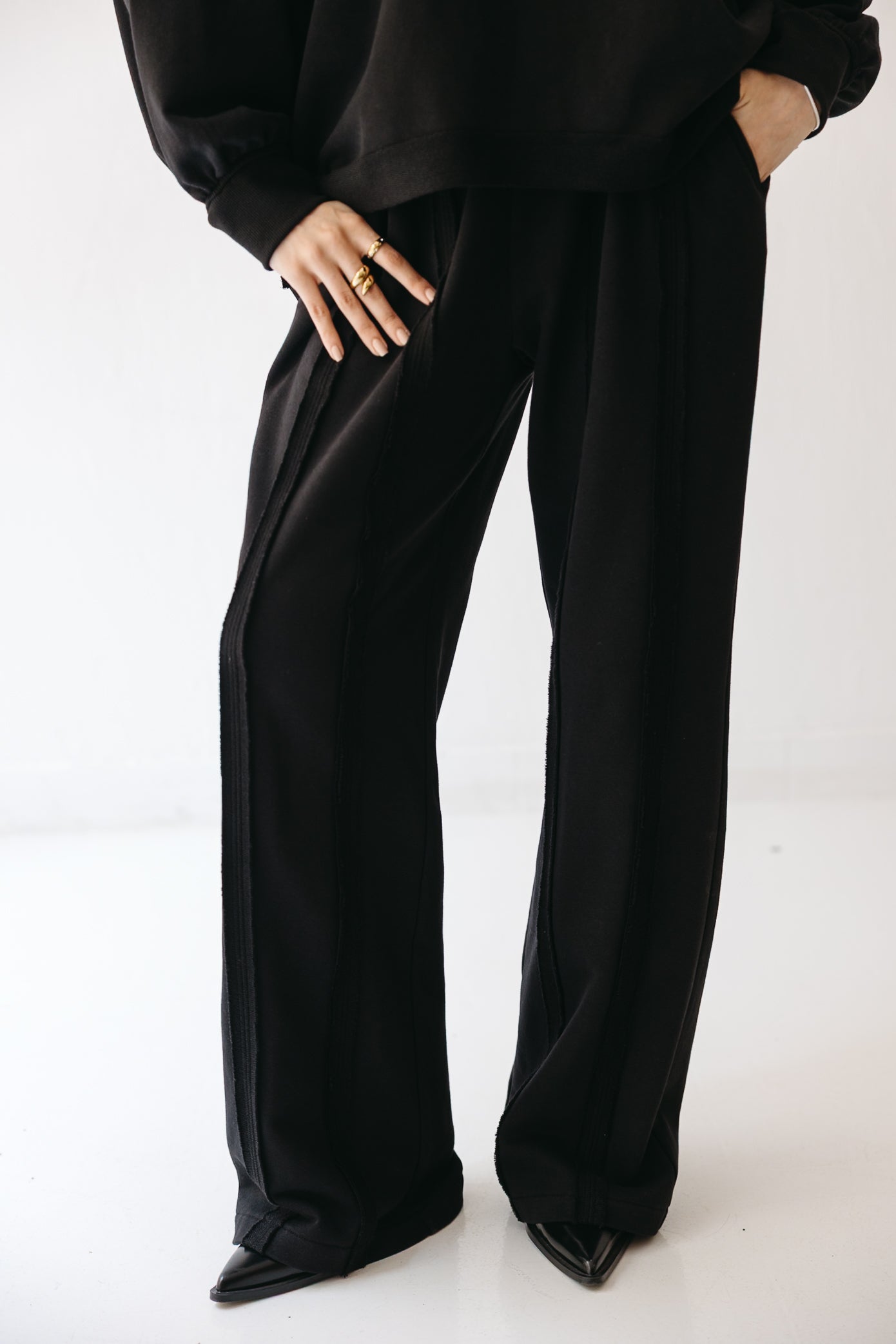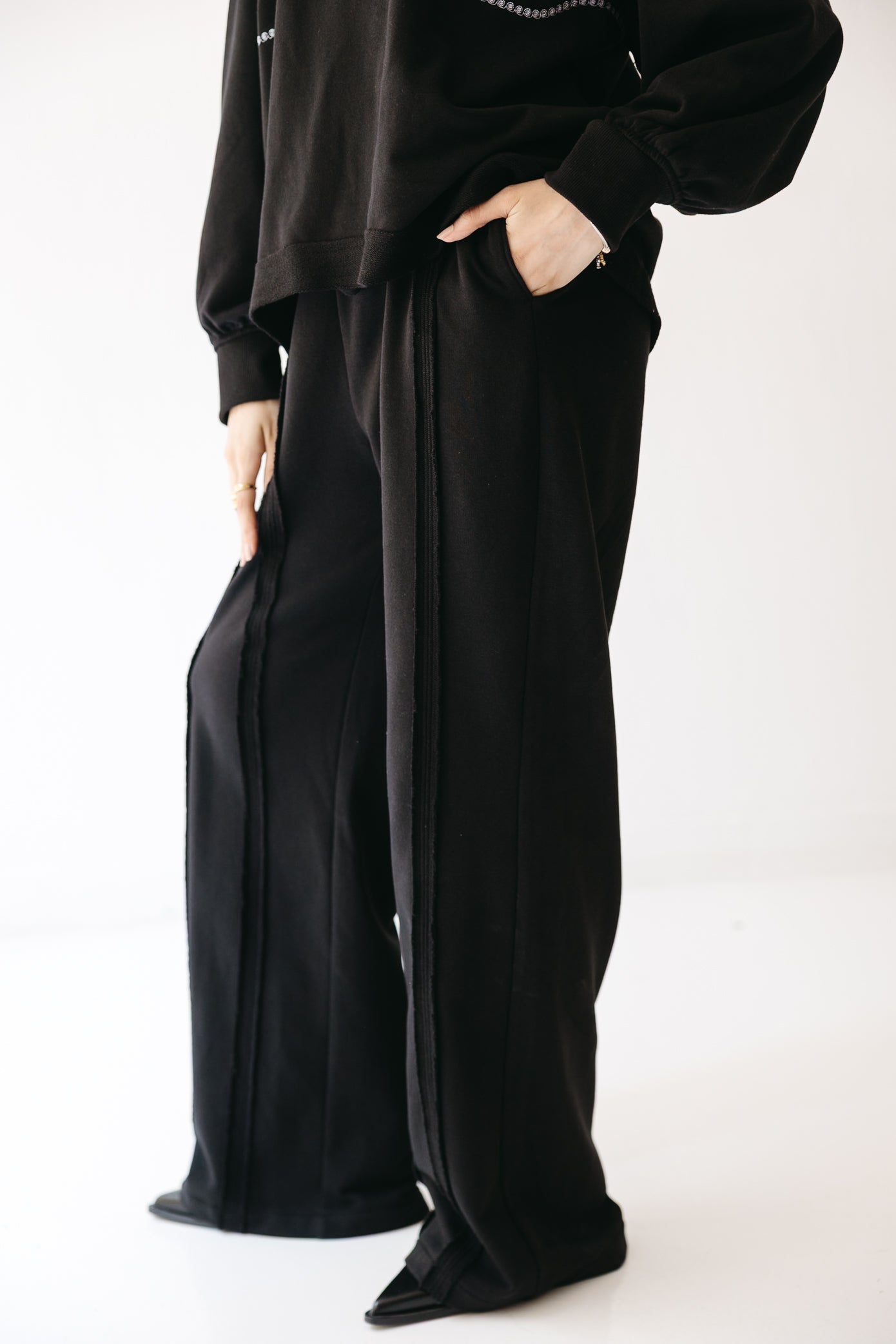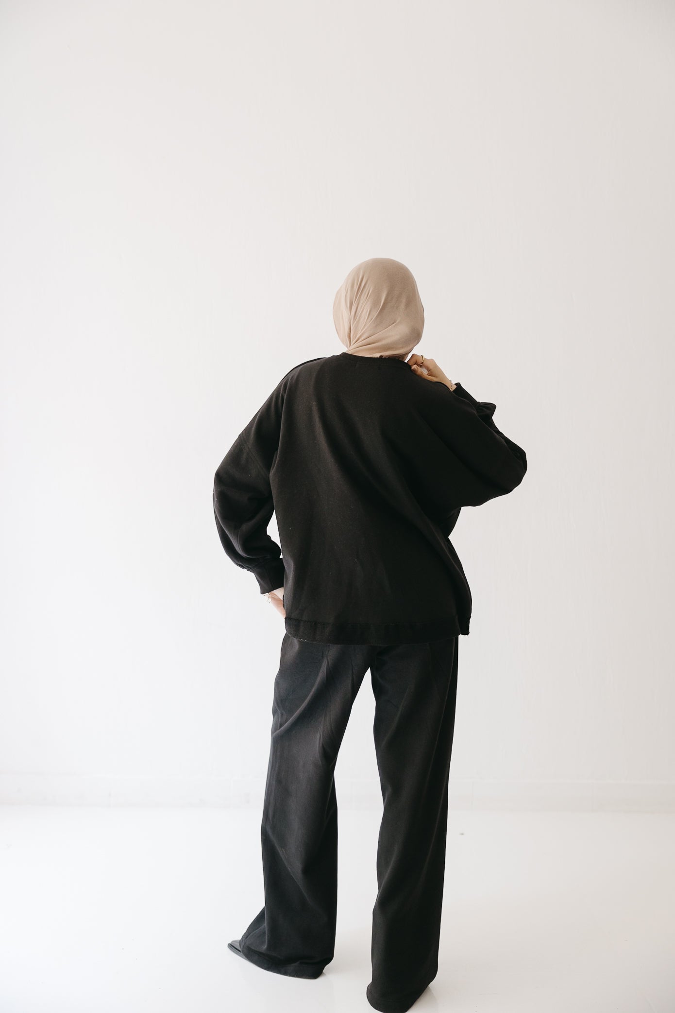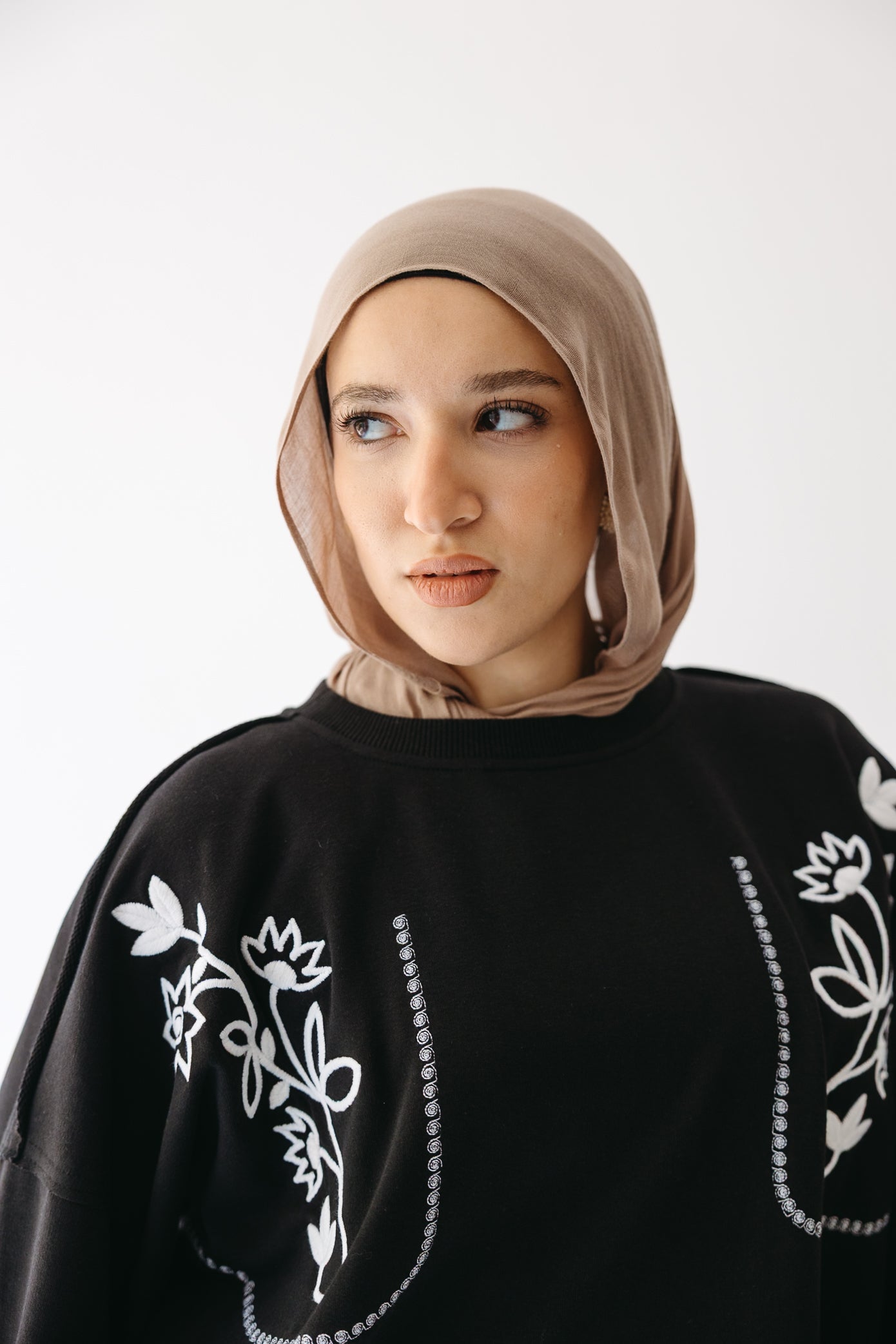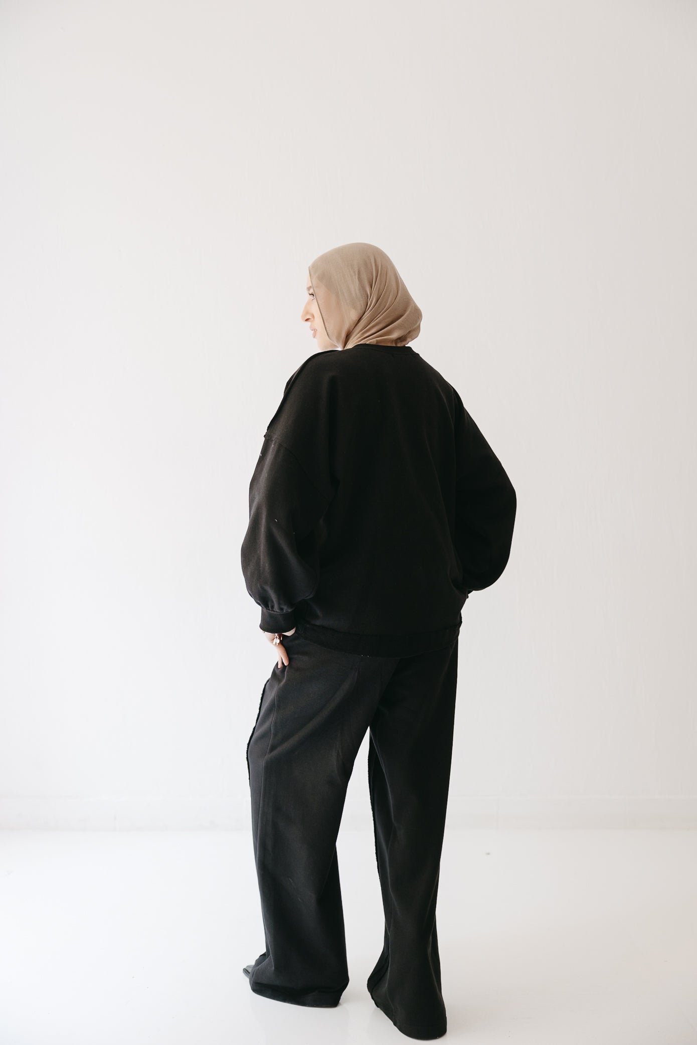 An elevated take on everyday comfort — crafted from soft black Milton fabric and adorned with delicate white floral embroidery. The oversized top paired with wide-leg pants creates a relaxed yet refined silhouette, making it the perfect blend of effortless style and timeless elegance.