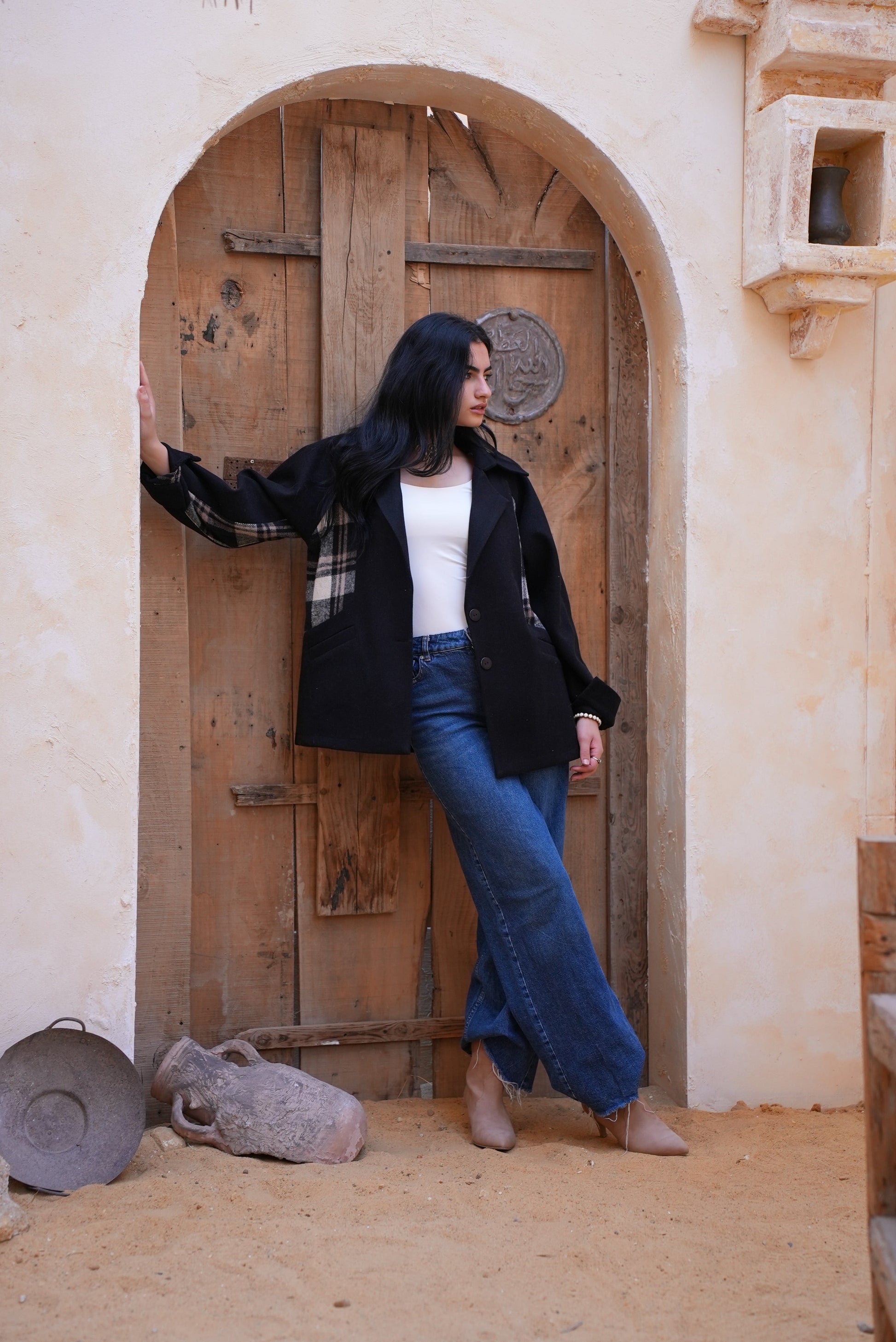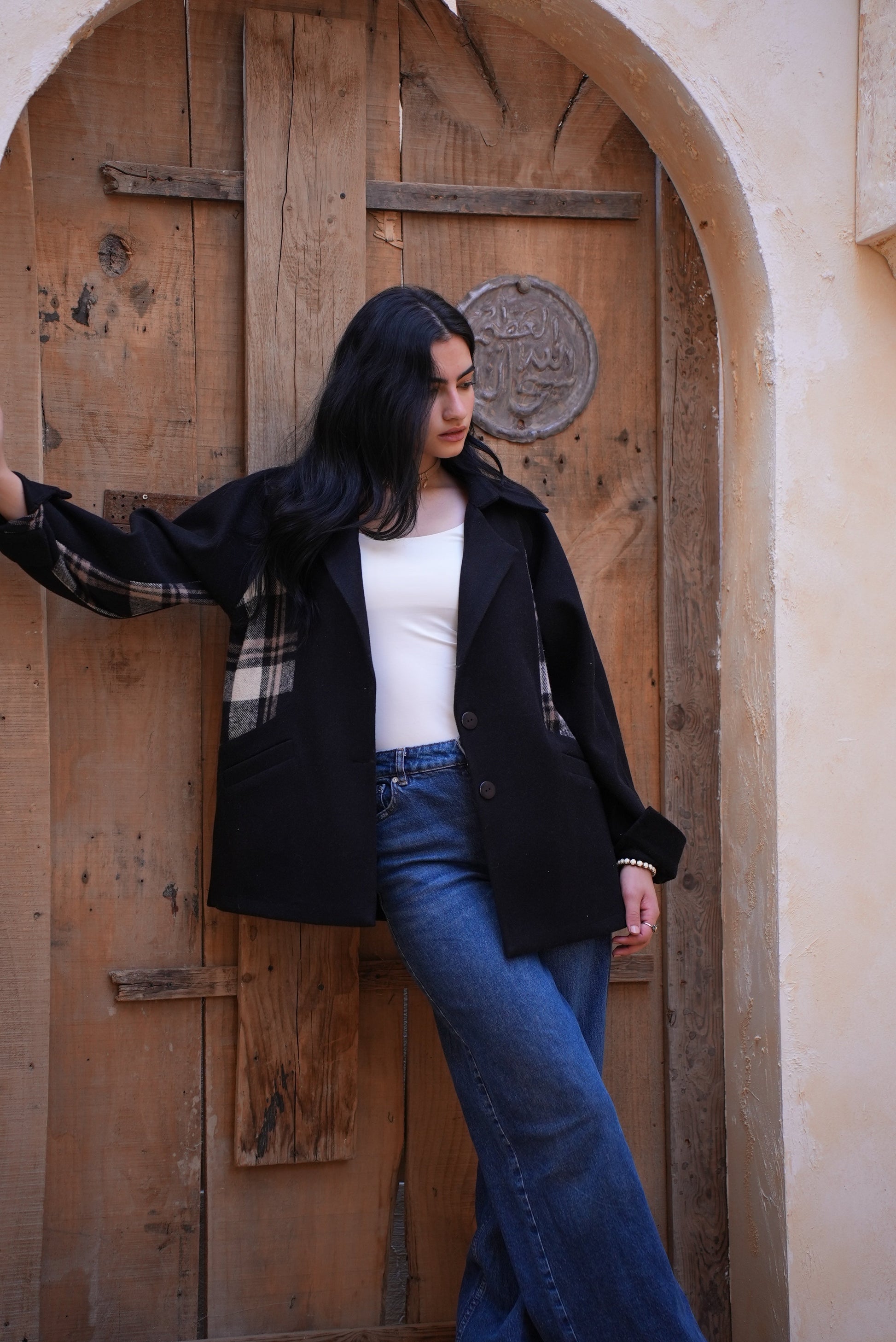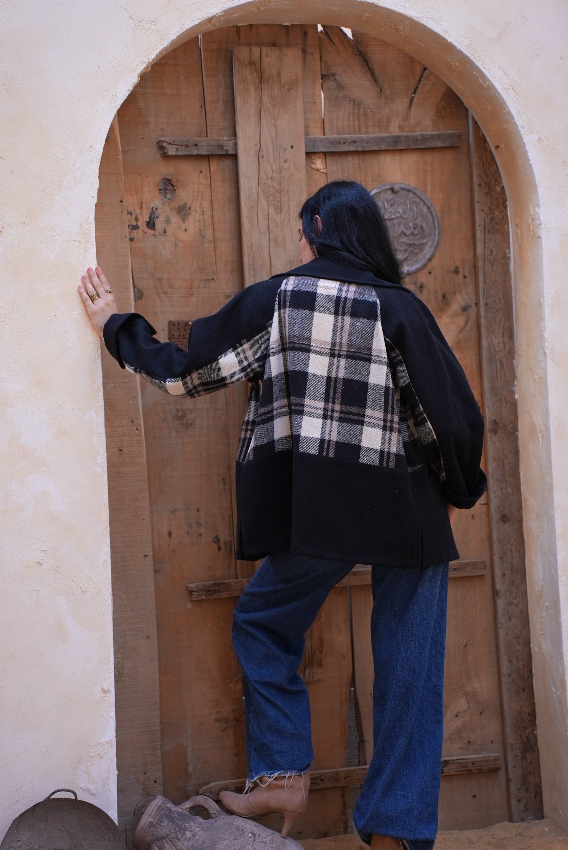 this jacket pairs sleek black wool with a plaid wool panel across the front and back for standout style. Finished with two functional side pockets, it’s the perfect blend of smart, warm, and effortlessly cool