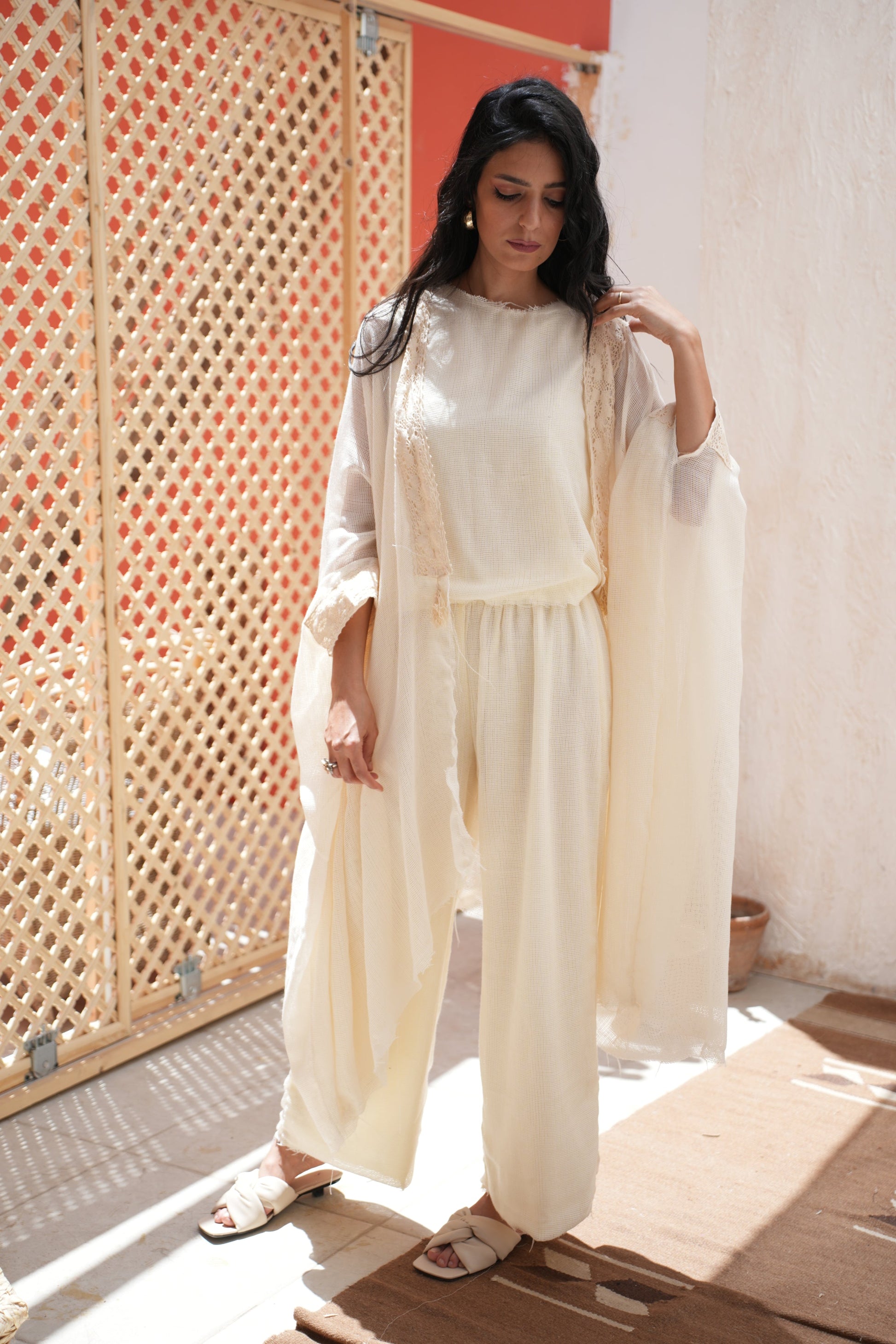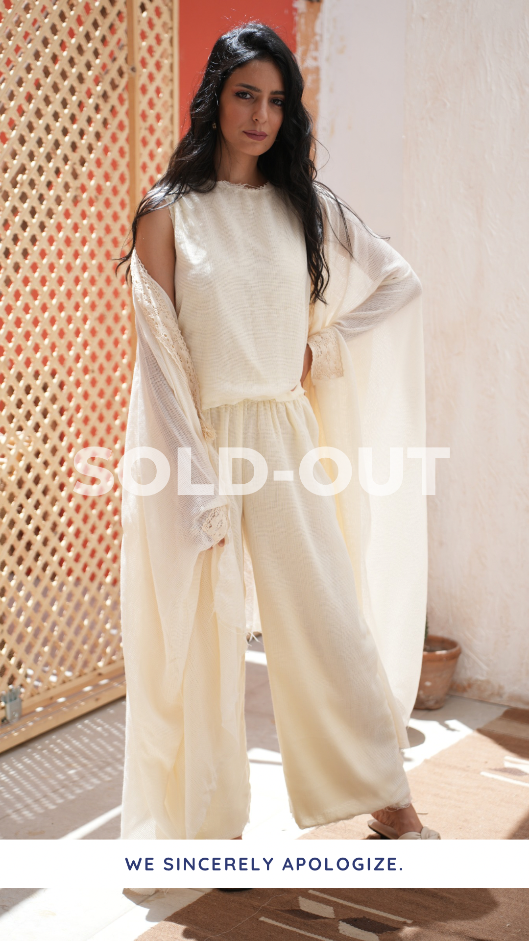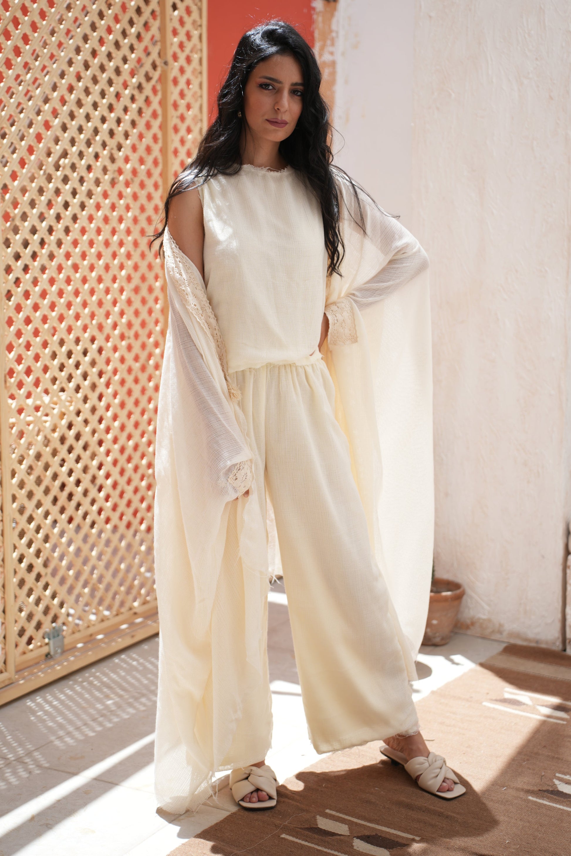 The ensemble includes a flowy open cardigan, a lined sleevless top, and matching lined pants