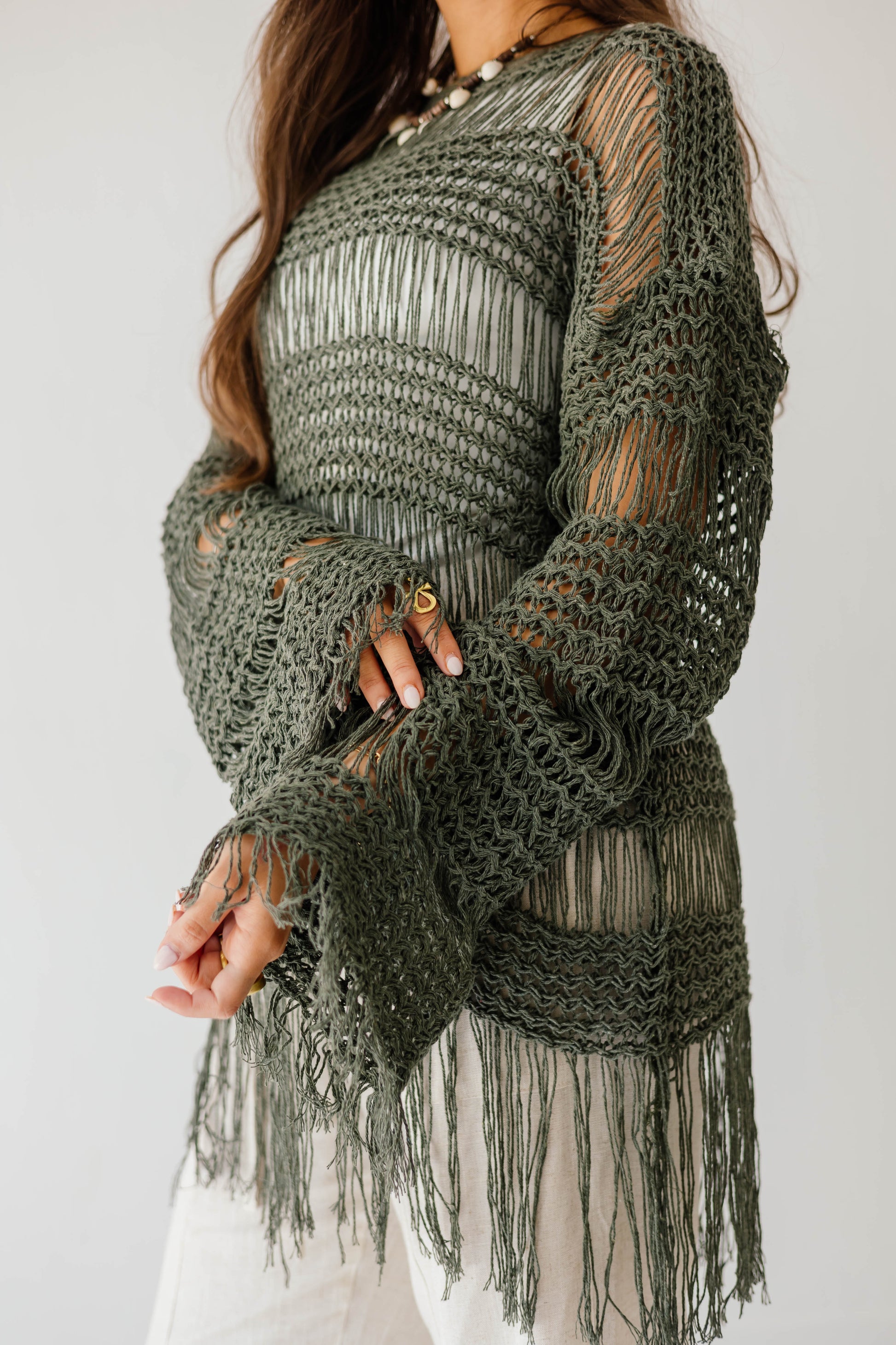 Handcrafted-style crochet with an airy weave and statement fringe—The Top is designed to layer beautifully over your favorite basics. The relaxed fit, flared sleeves, and soft texture make it perfect for breezy days, beachy vibes, or city strolls with a twist of edge.