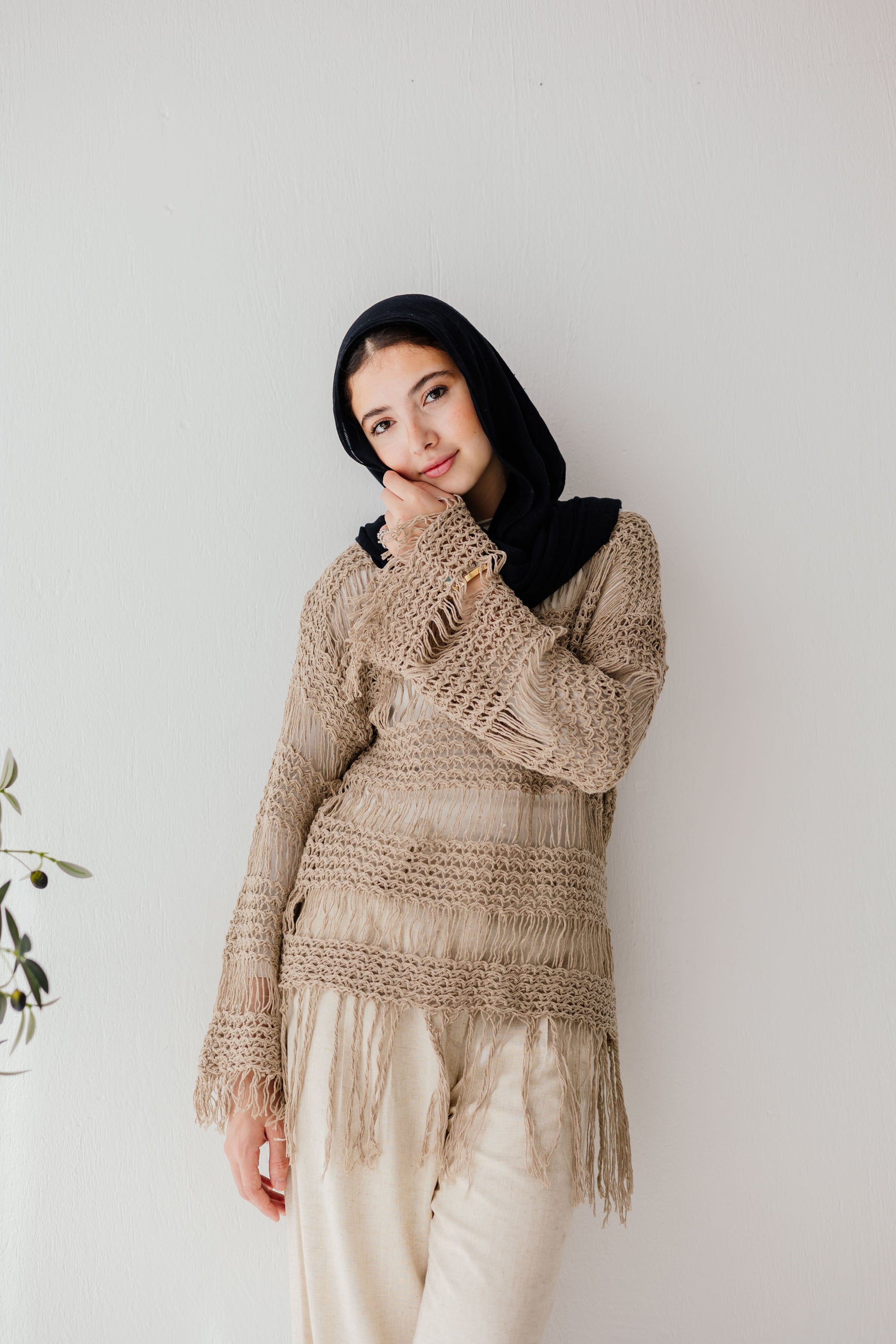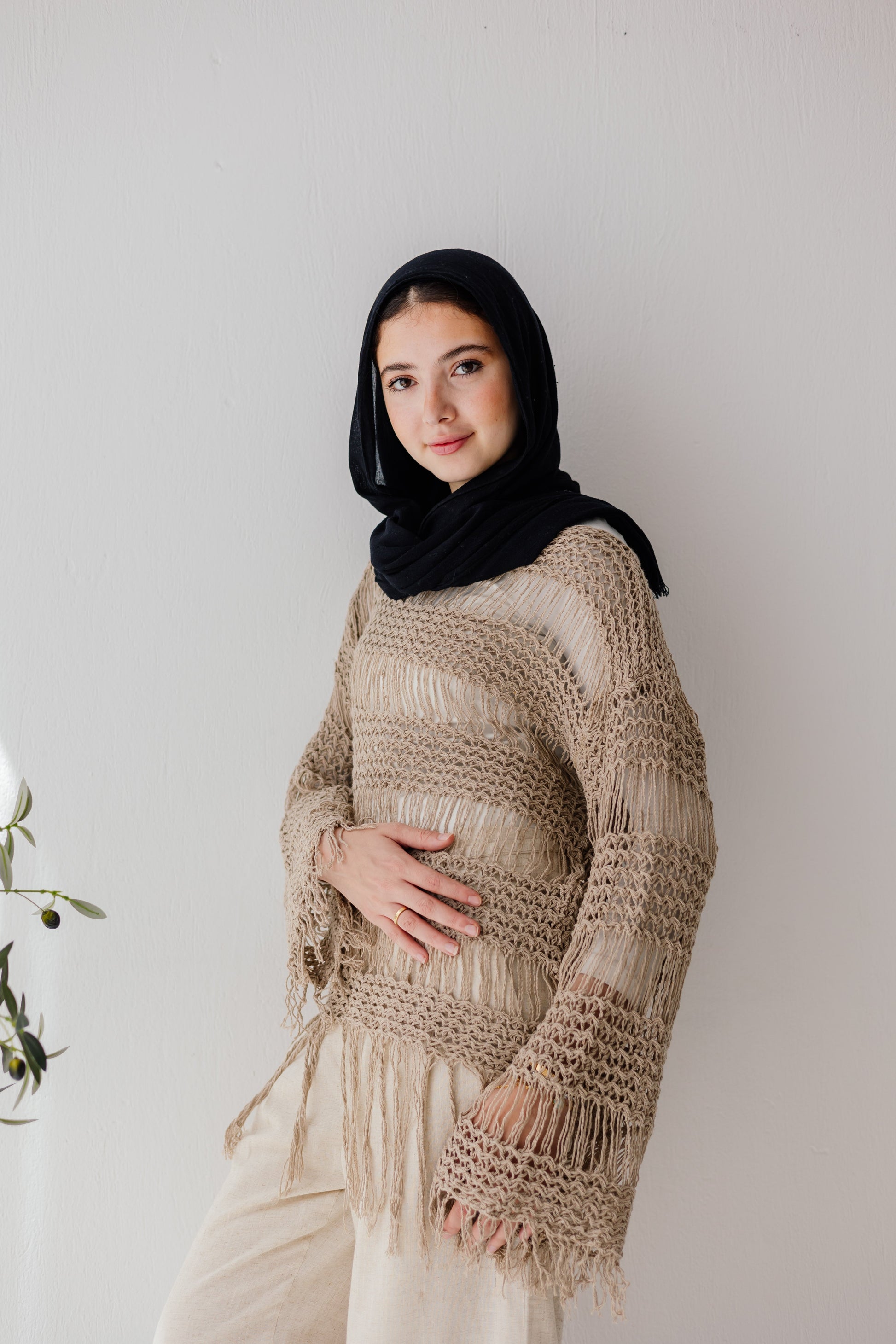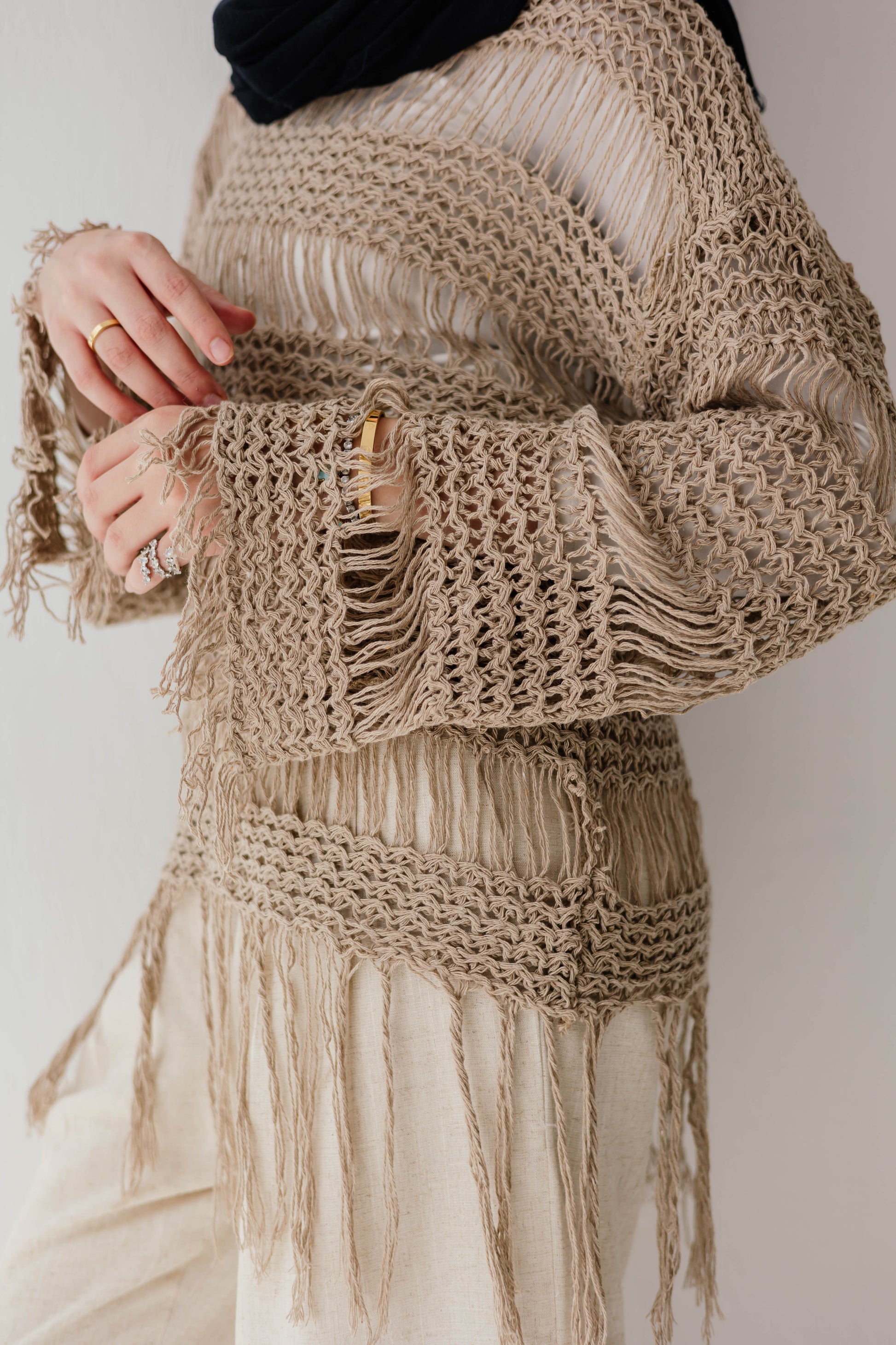Handcrafted-style crochet with an airy weave and statement fringe—The Top is designed to layer beautifully over your favorite basics. The relaxed fit, flared sleeves, and soft texture make it perfect for breezy days, beachy vibes, or city strolls with a twist of edge.