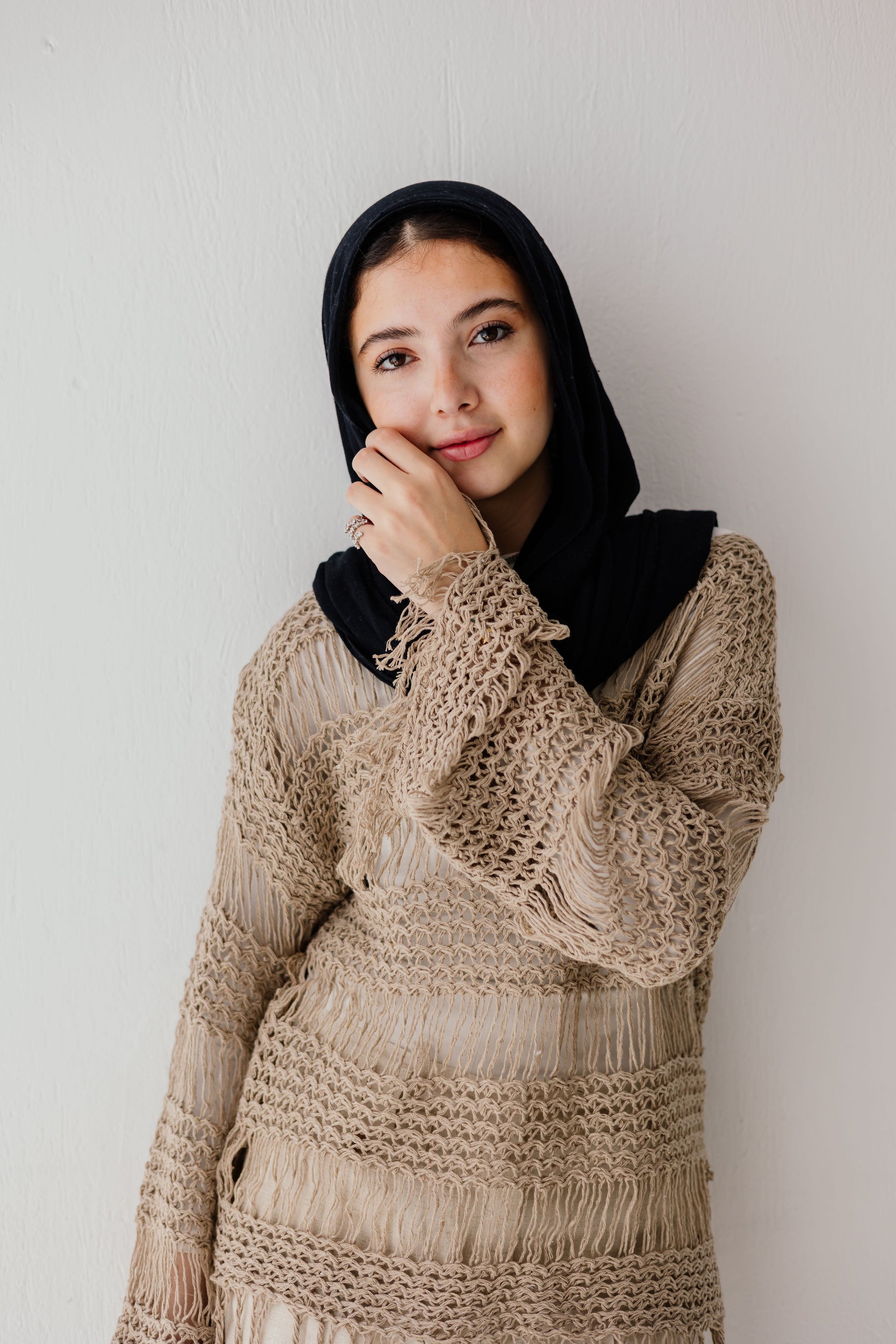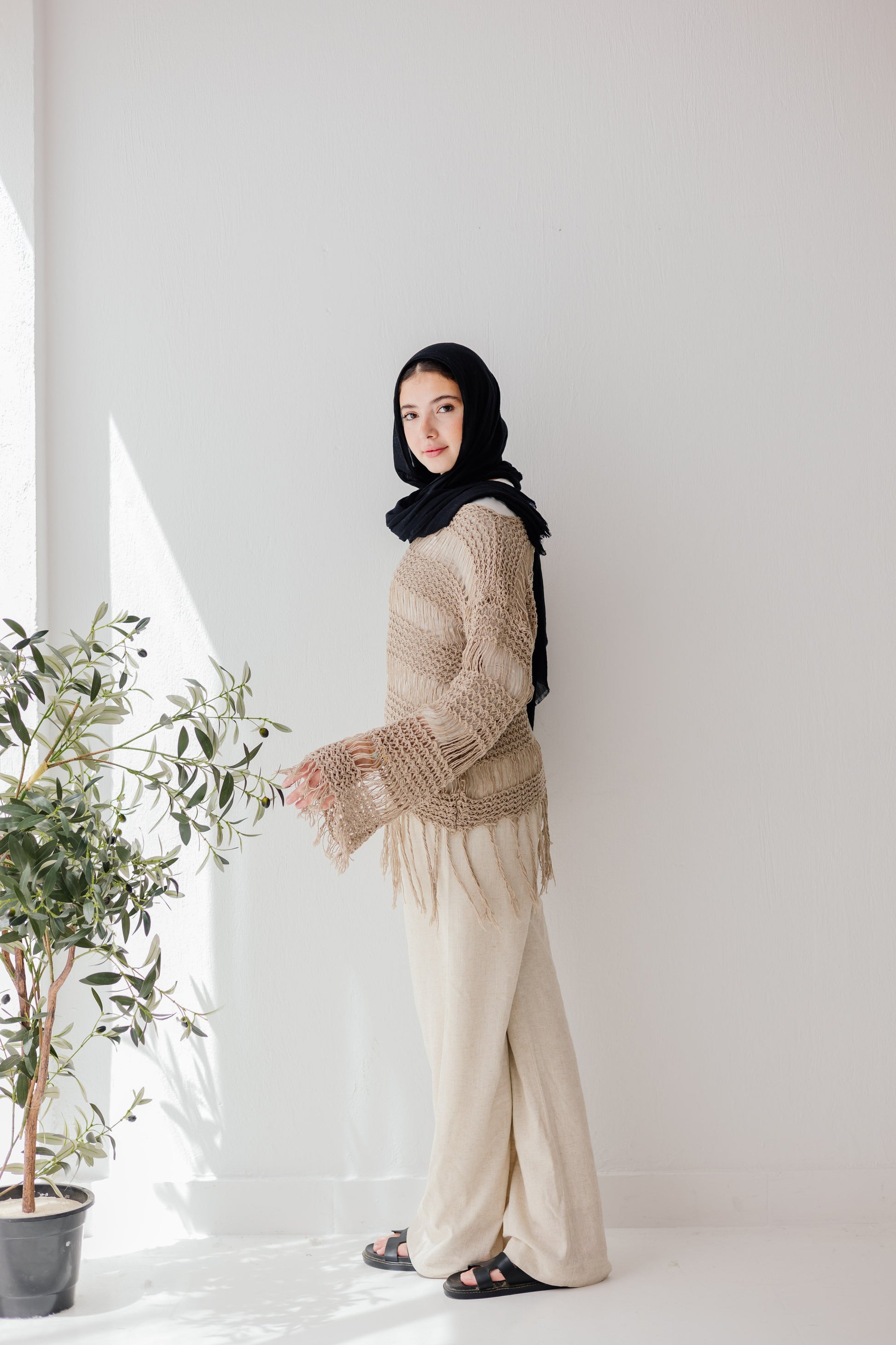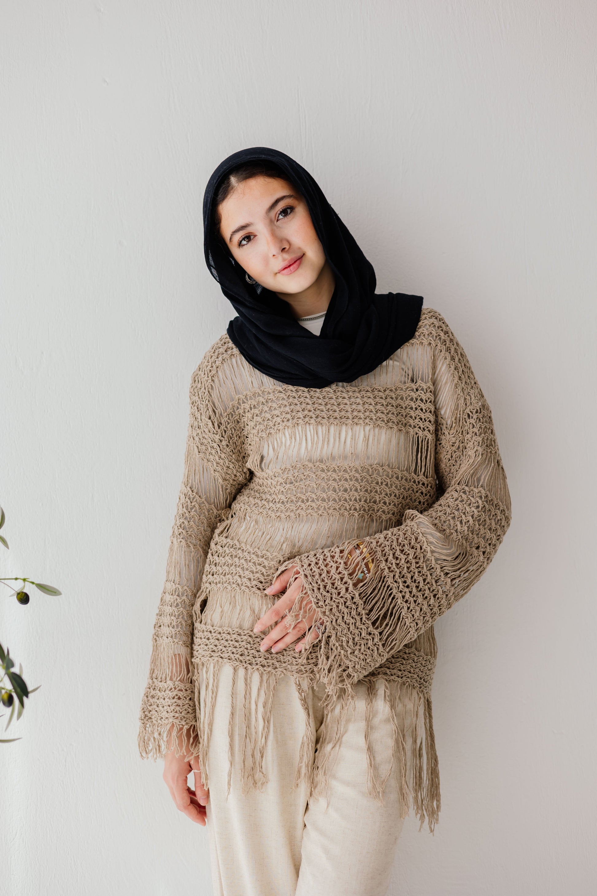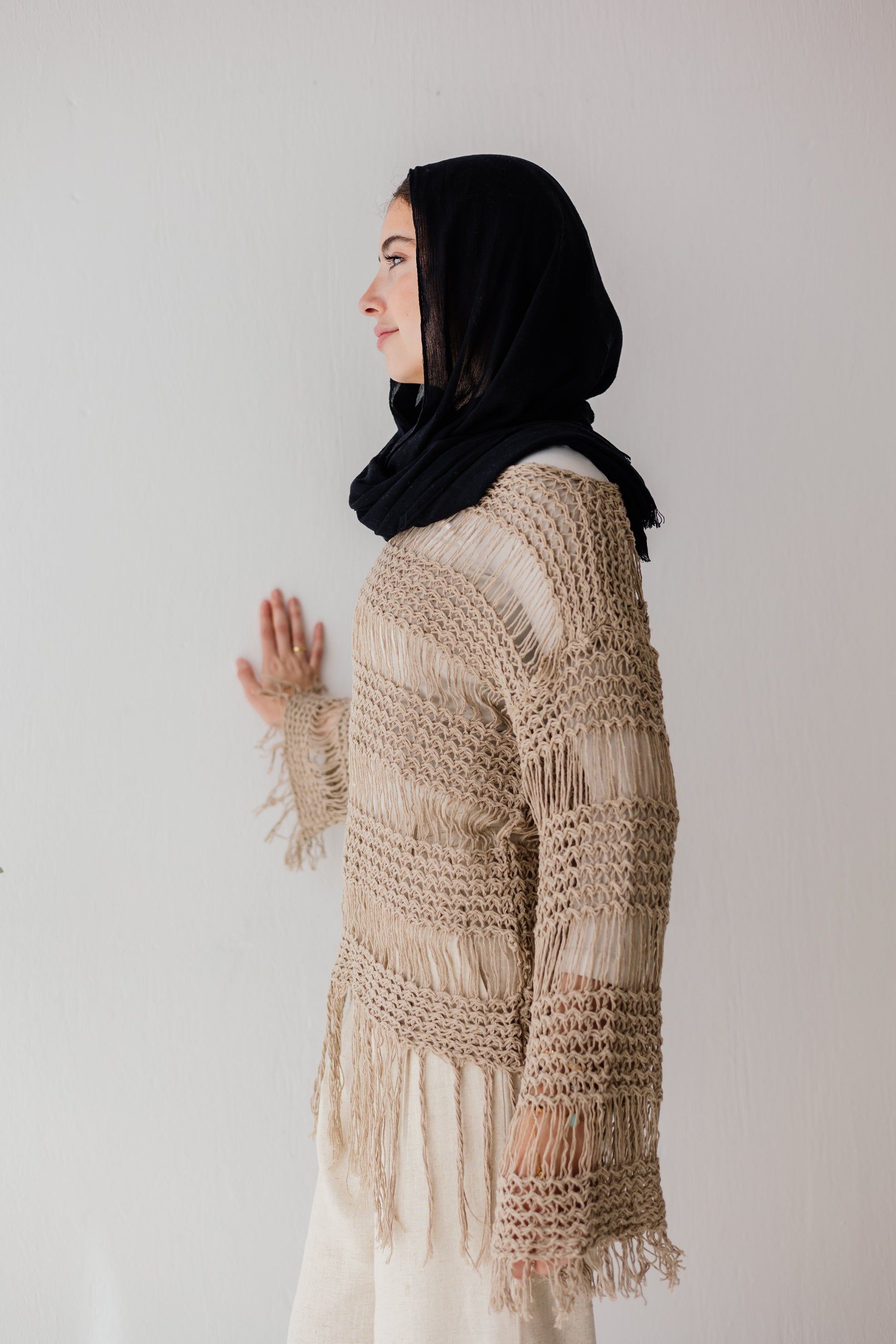 Handcrafted-style crochet with an airy weave and statement fringe—The Top is designed to layer beautifully over your favorite basics. The relaxed fit, flared sleeves, and soft texture make it perfect for breezy days, beachy vibes, or city strolls with a twist of edge.