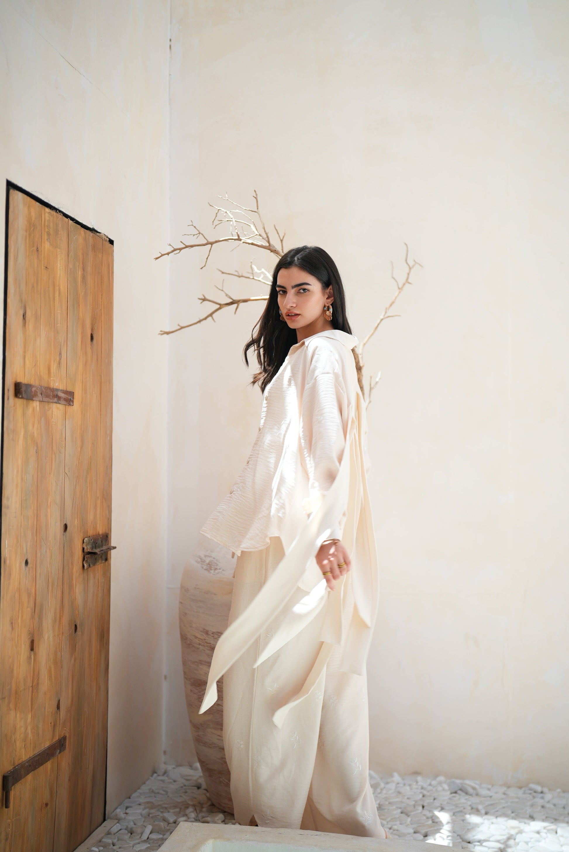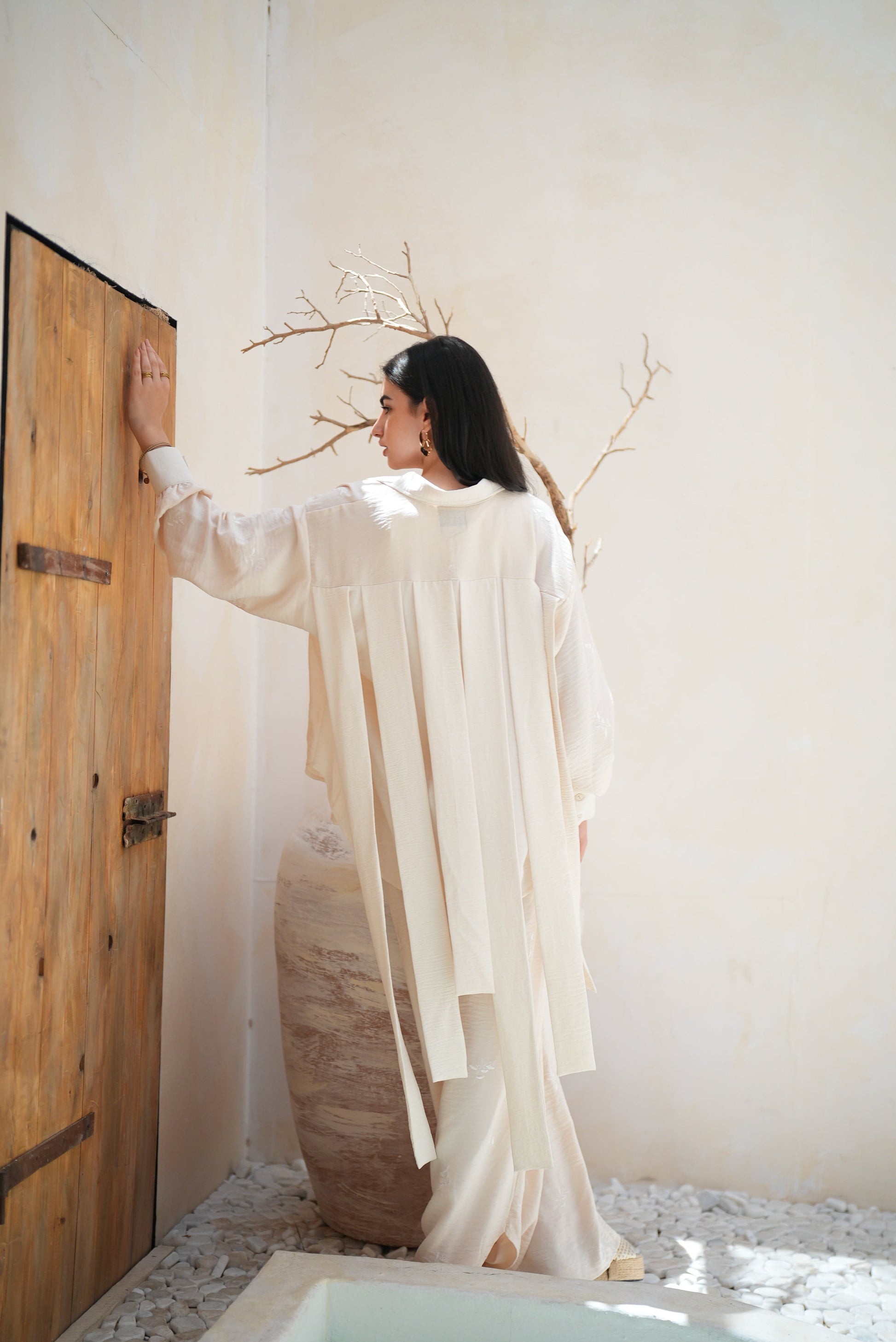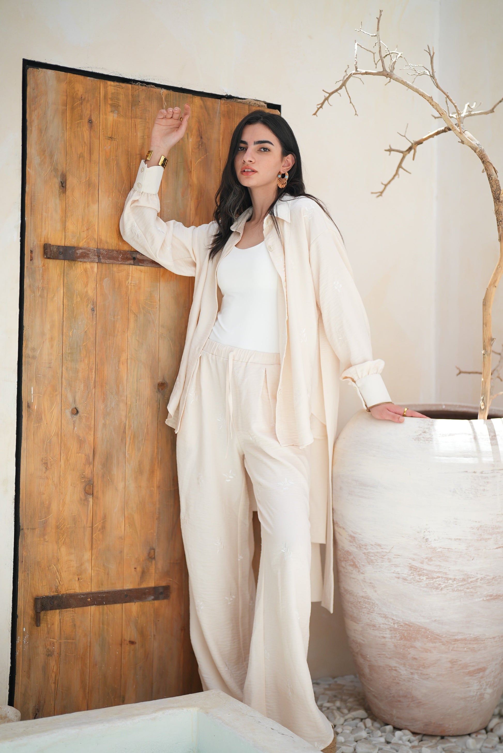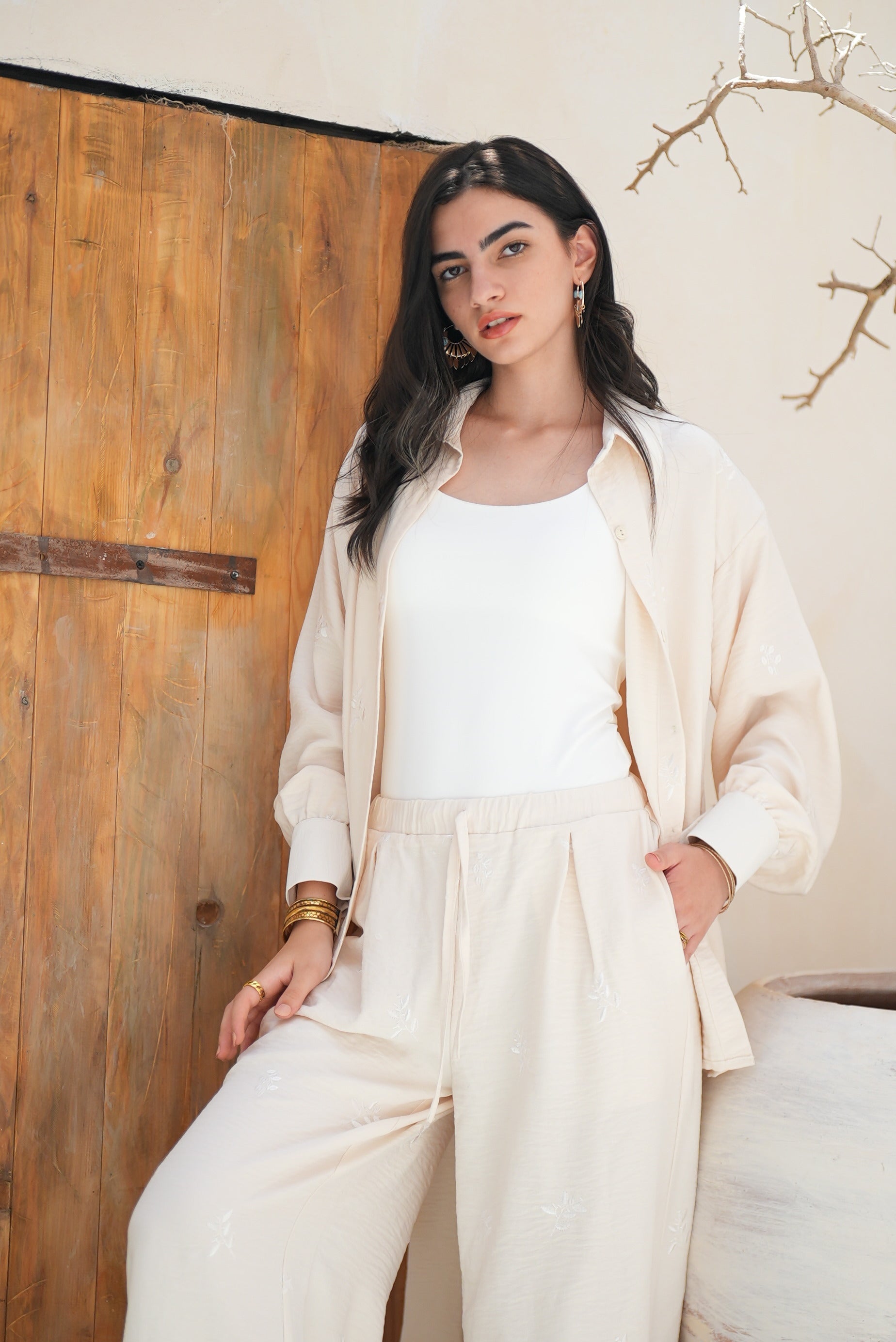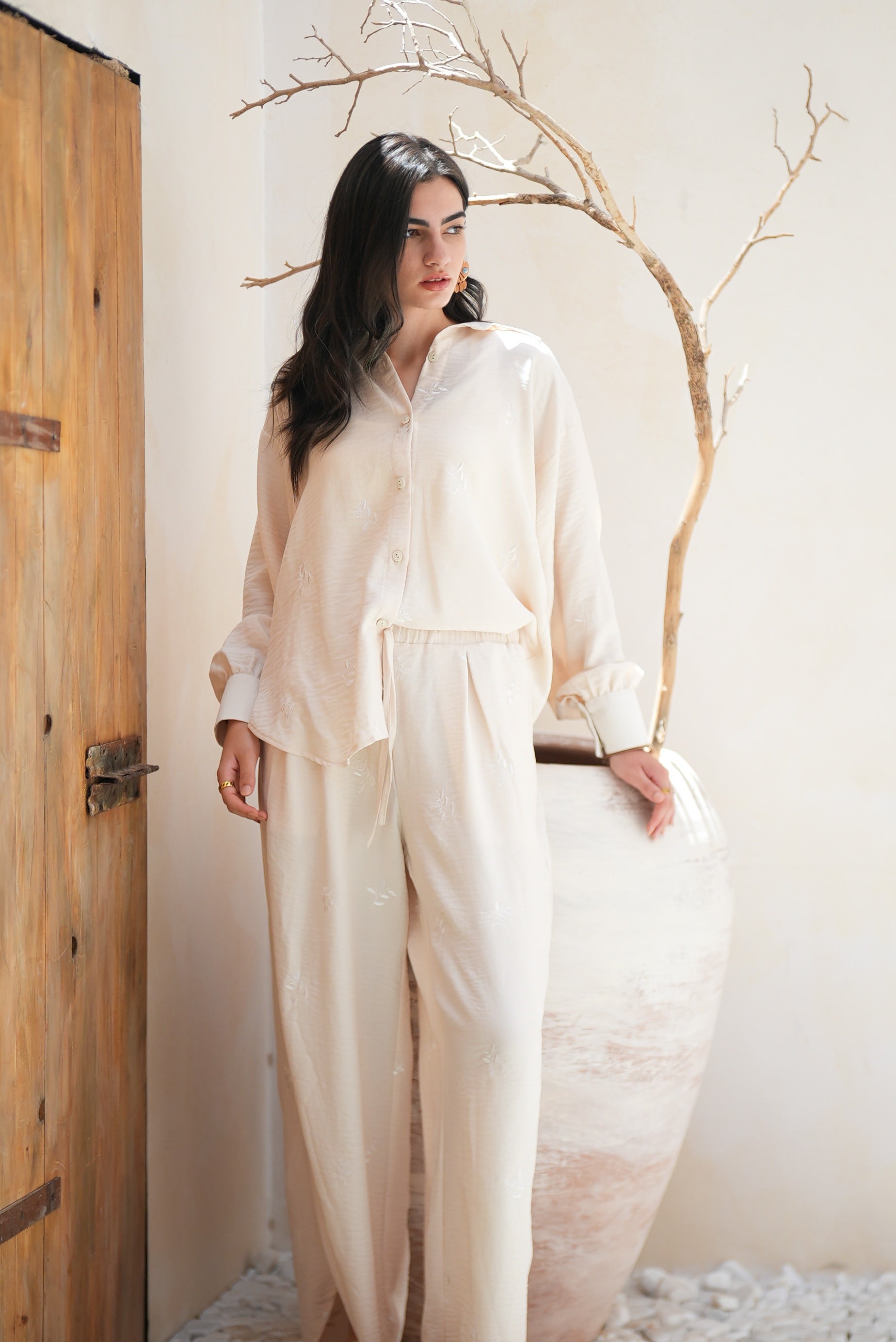 A monochrome set that blends two fabrics in harmony — one smooth, one delicately embroidered with tonal floral motifs.