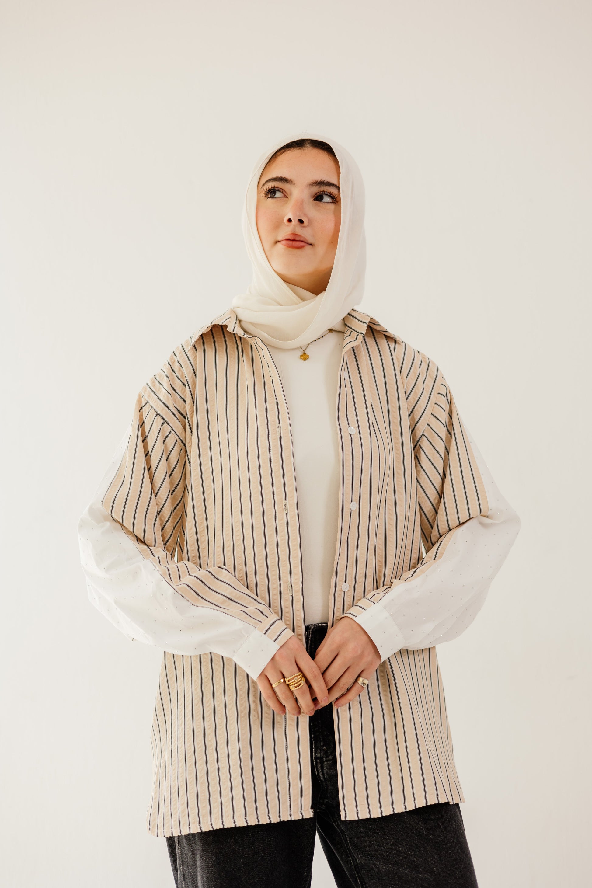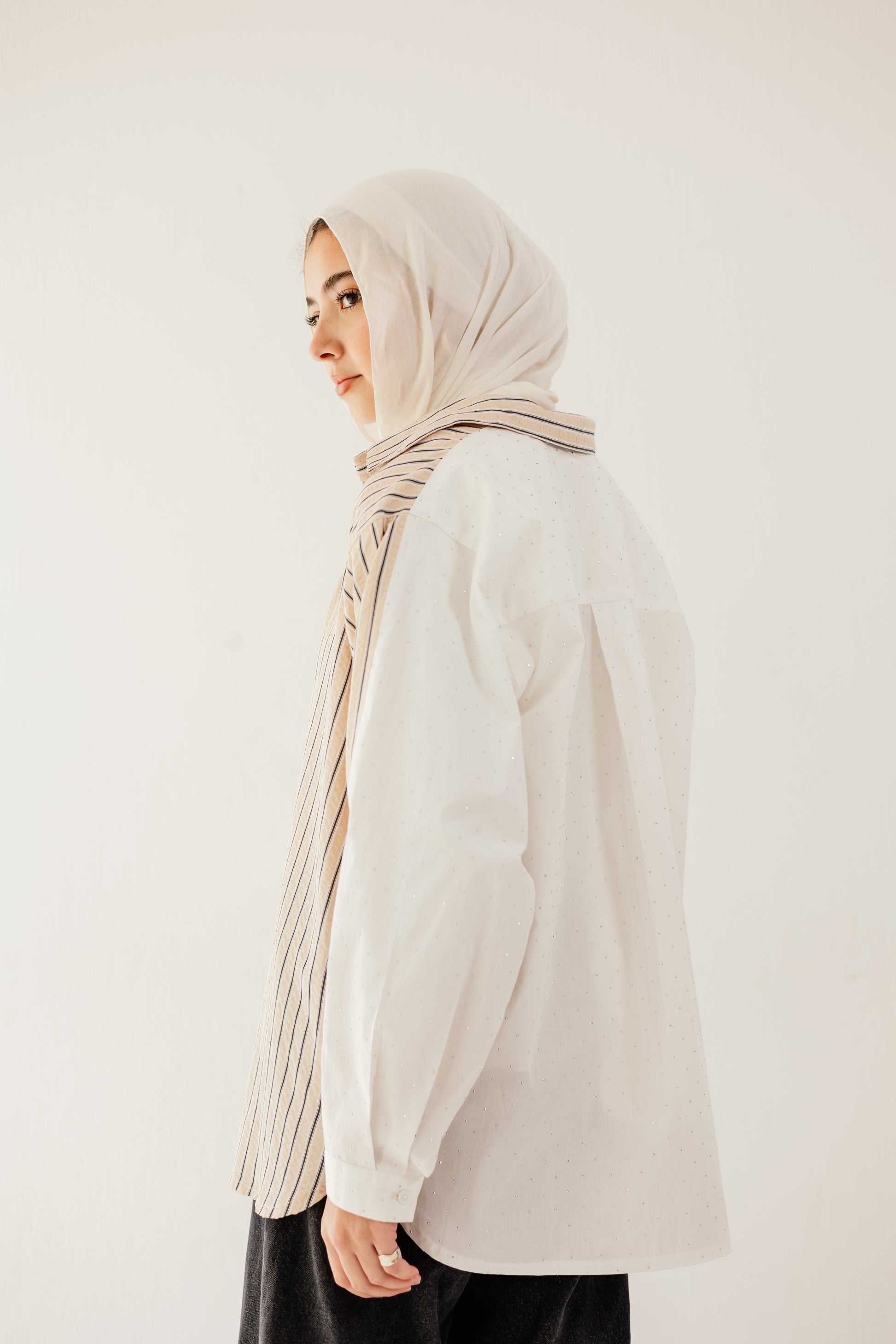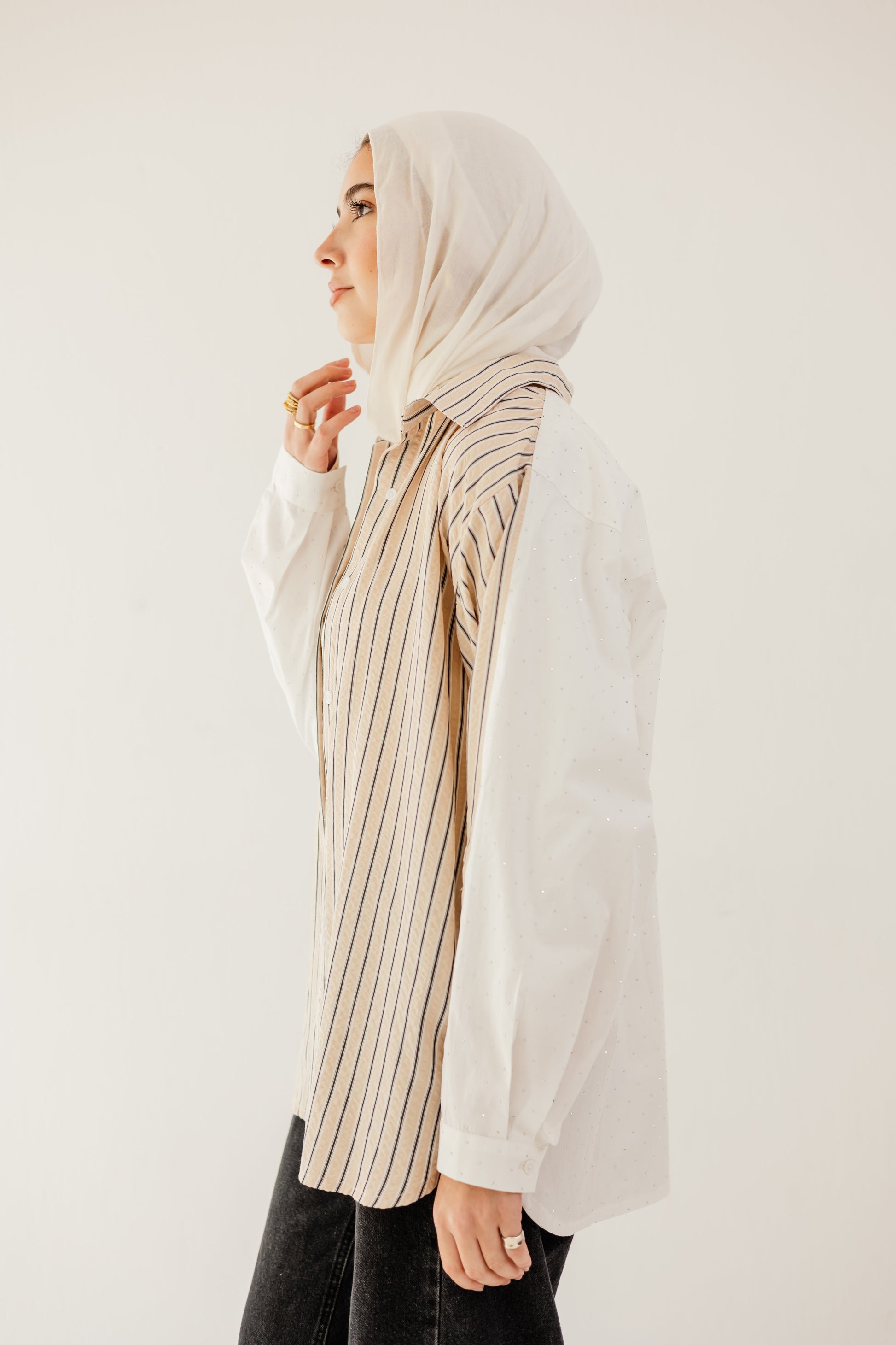 Stripe & Stud Shirt – A bold fusion of classic and edgy, the Stripe & Stud Shirt is designed for effortless style. Featuring a sleek striped front for a timeless look and a plain back adorned with metallic studs, this shirt balances sophistication with a touch of attitude. The lightweight fabric ensures comfort, while the unique contrast detail makes it a standout piece. Perfect for dressing up or down, this versatile shirt pairs seamlessly with jeans for a casual-chic look or tailored trousers for a more polished vibe.