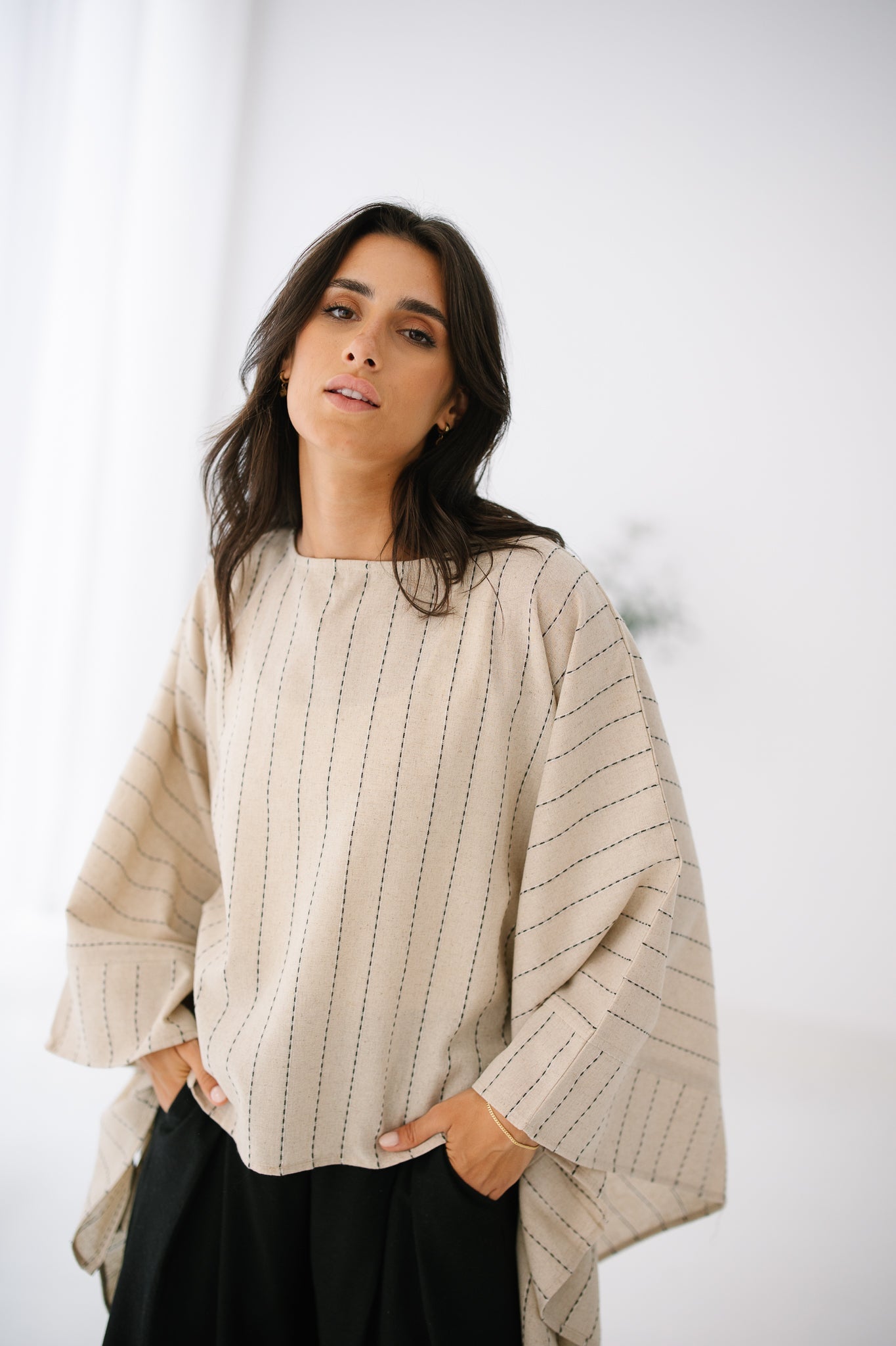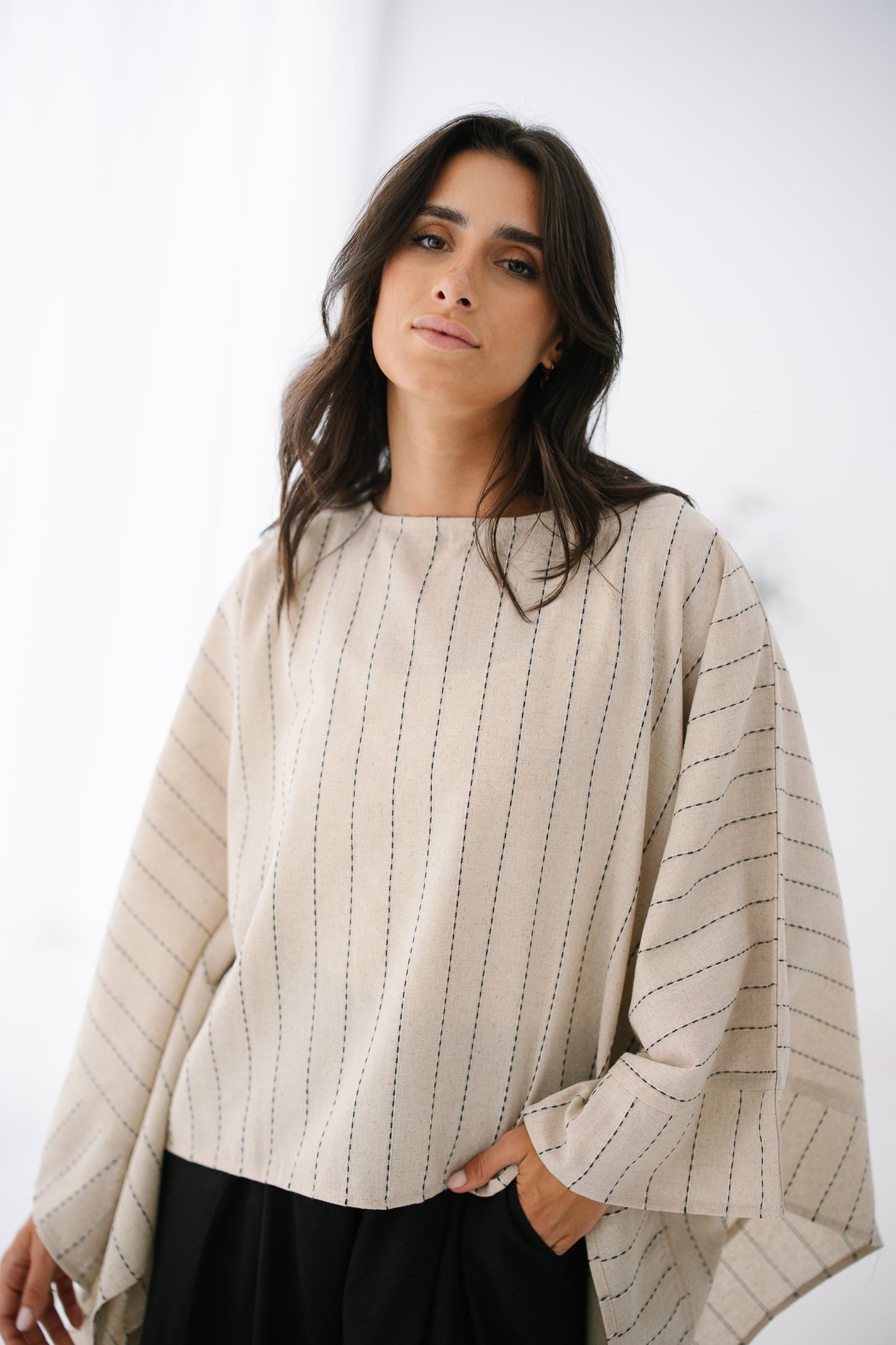 Striped Embroided cape top made of Pure Linen.
