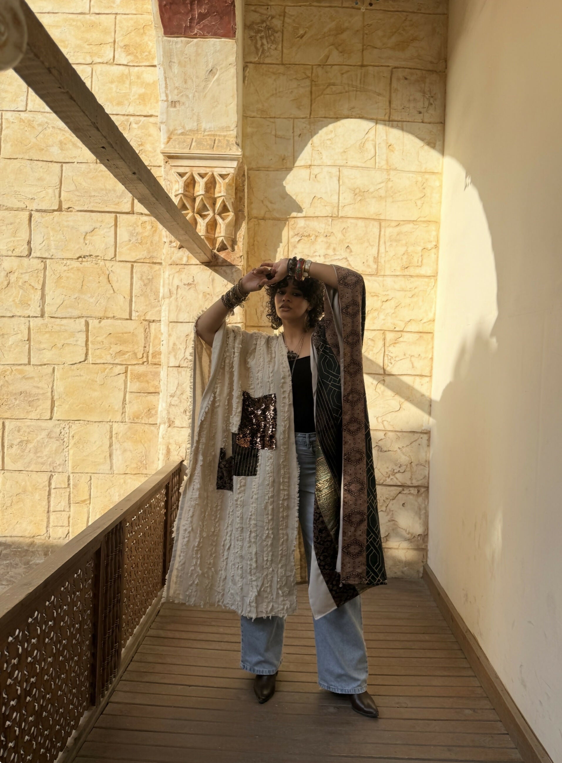 Flowing silhouettes meet patchworked details, creating a piece that feels both effortless and artful. No two fabrics are exactly alike, making every kaftan truly one of a kind.